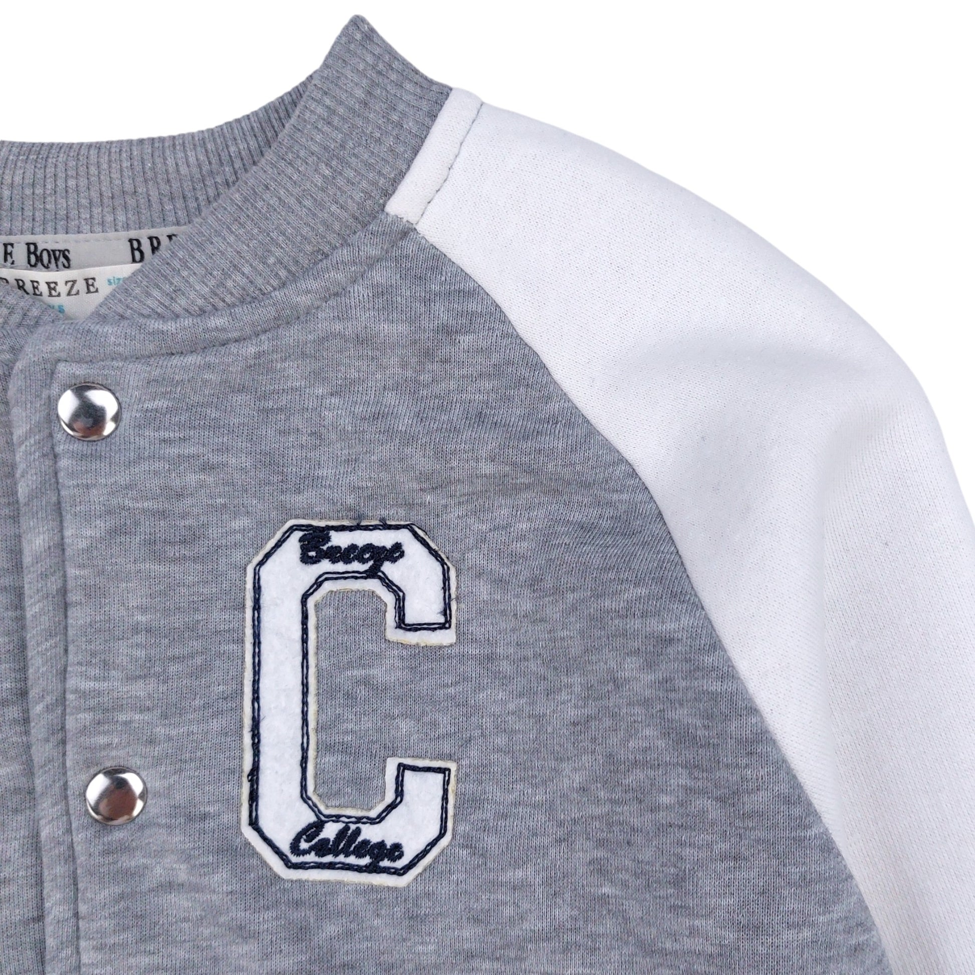 Boys' Breeze sweatshirt model 19583-23824 GKMOC is a stylish baseball cap for the autumn-winter season, made in shades of gray with contrasting white sleeves. Made entirely of high-quality cotton (100%), it ensures maximum comfort and breathability. Fastened with snaps, with an elegant patch with the letter "C" on the chest, it emphasizes the sporty, yet fashionable style. The cuffs on the sleeves and bottom of the sweatshirt ensure a good fit and comfort of movement. It is the perfect everyday choice for a boy who values comfort and a fashionable look.