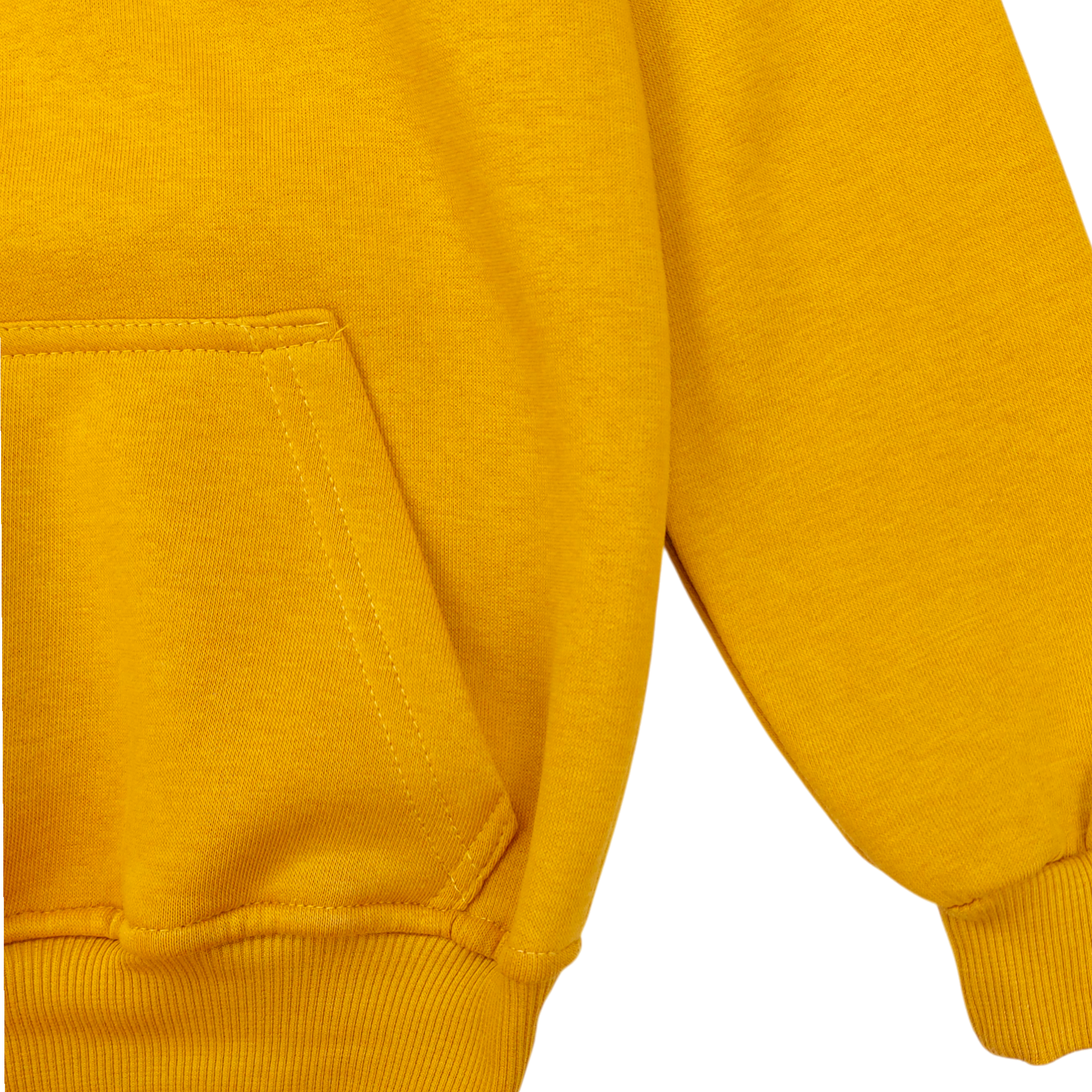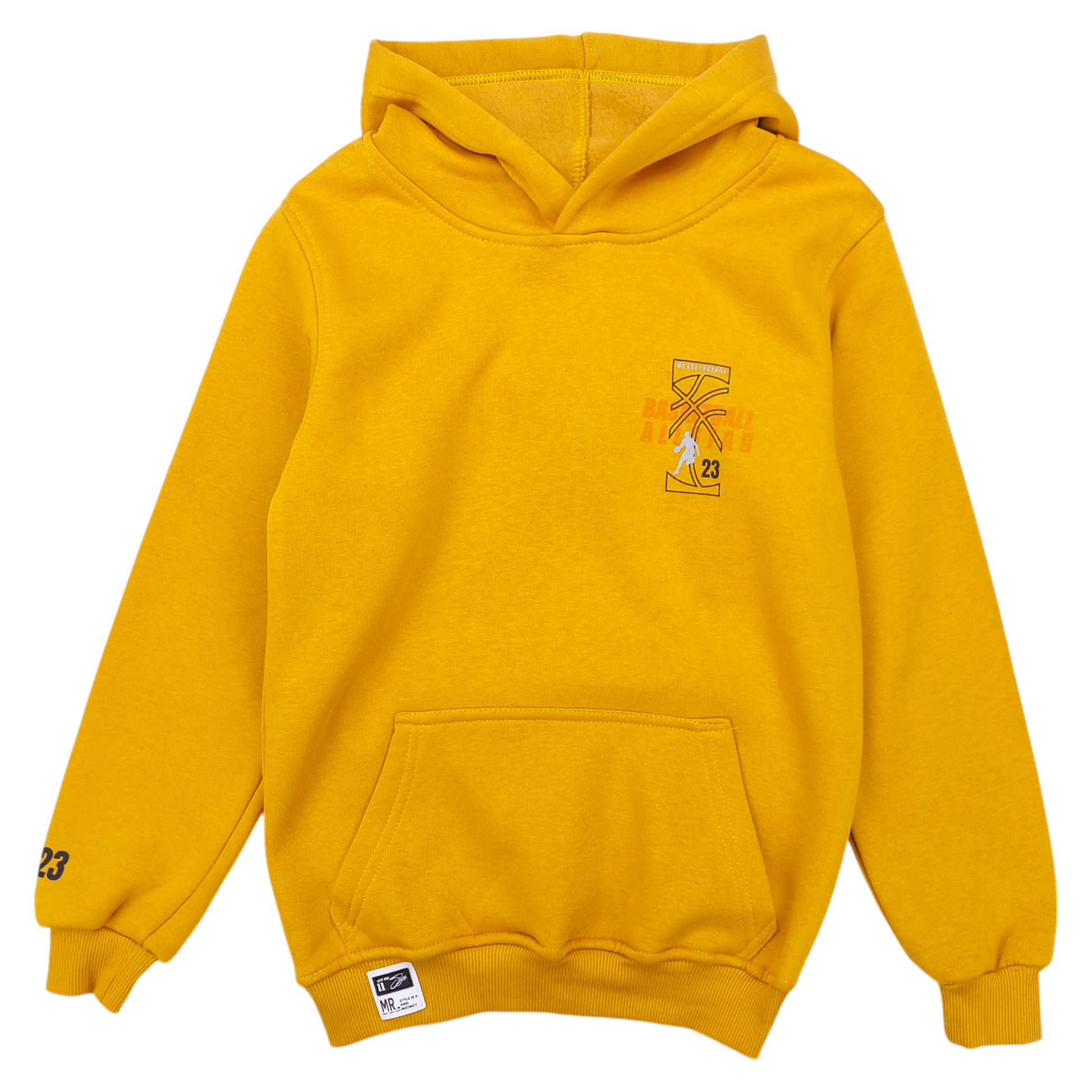 Boys' kangaroo sweatshirt with a hood, made of warm and comfortable material. Yellow colors and subtle prints on the sleeve and front give it a modern look. The sweatshirt has a practical kangaroo pocket and elastic cuffs on the sleeves and bottom, which ensures comfort of wearing and protection against the cold. Perfect for the autumn-winter season.