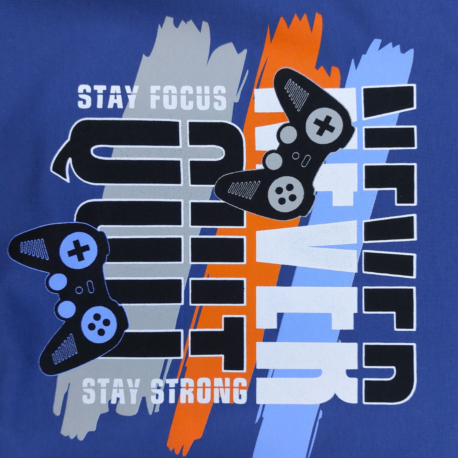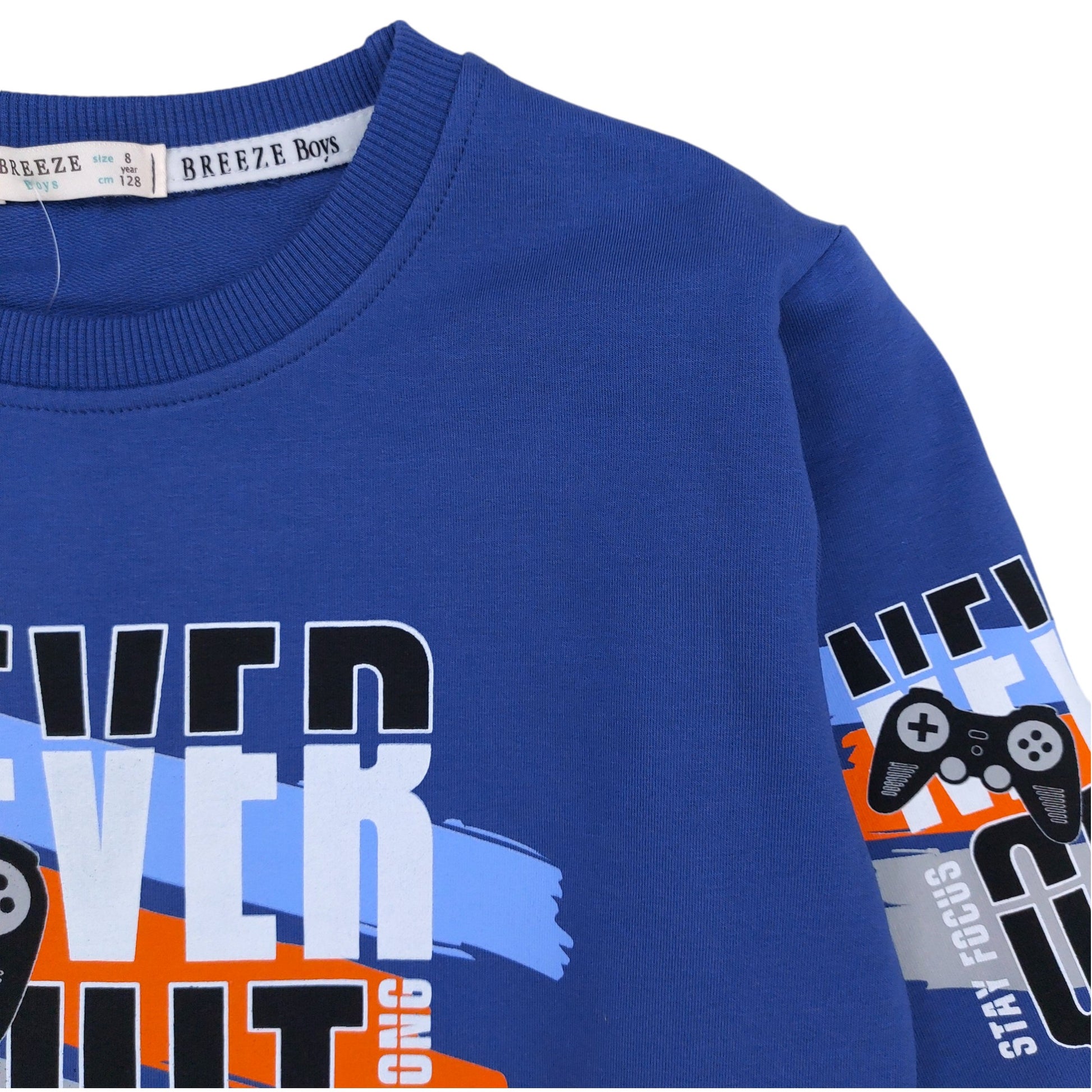 Boys' Breeze sweatshirt model 20646-23824 GKMOC is a sporty proposition for the autumn-winter season, made in blue. It contains a fashionable print with the "Never Quit" motif and a game pad graphic, ideal for young gaming enthusiasts. The composition of the sweatshirt is 90% cotton and 10% elastane, which ensures comfort and elasticity, as well as freedom of movement. The sweatshirt has cuffs on the sleeves and bottom, which additionally emphasizes its sporty style. It is an ideal choice for an active day or everyday, combining comfort with a fashionable look.