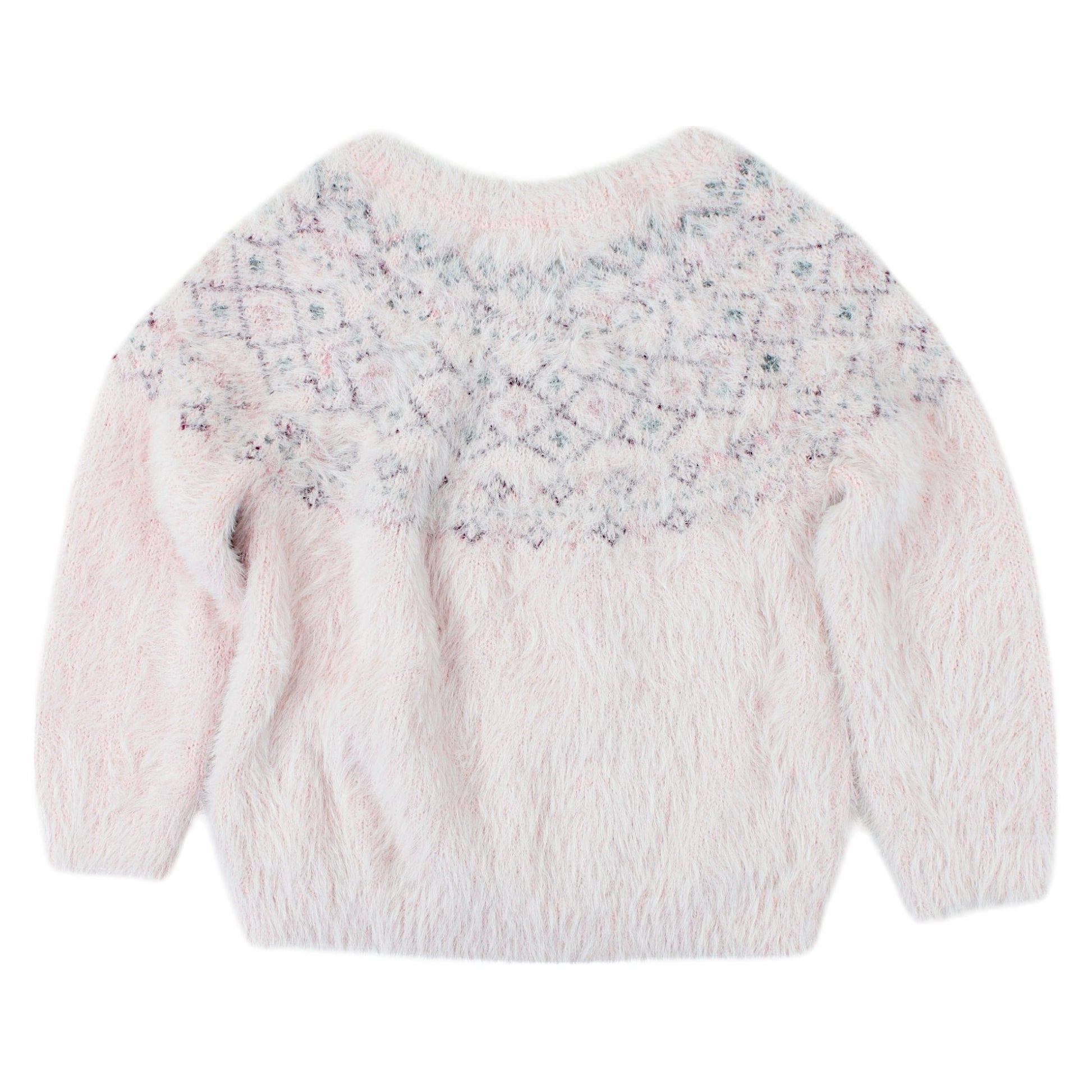 A lovely girl's sweatshirt in pink made of soft fur . Long sleeves and a round neckline provide comfort and warmth. Decorated with a pattern on the yoke in pastel colors, adding a delicate charm. Perfect for cooler days in the spring-summer season. No pockets or fasteners, put on over the head .