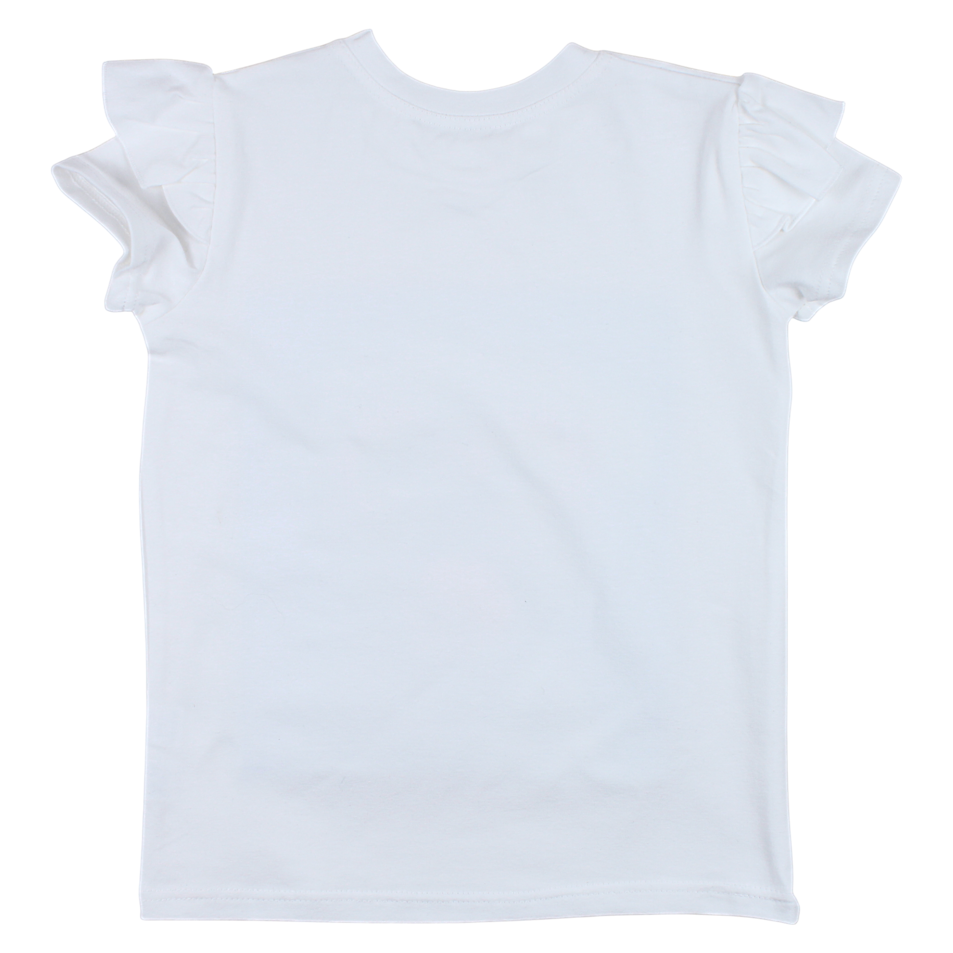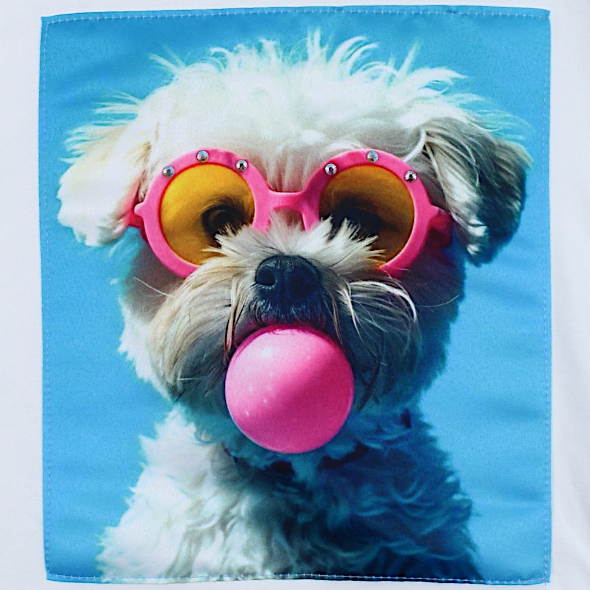 We present a cream Guliwerkids girl's blouse , which will certainly become a favorite element of every girl's wardrobe. The blouse is kept in a delicate cream color , which adds to its versatility and makes it perfectly match other clothes. On the front there is a colorful print of a cute dog with pink lipstick and sunglasses, which gives the blouse a unique and cheerful character. An additional advantage are the short sleeves finished with subtle frills , which add lightness and girlish style. The blouse is easy to put on over the head, making it comfortable to use for children. It is made of soft, breathable cotton fabric with the addition of elastane, which ensures comfort of wearing even on warmer days. This is the perfect choice for the spring-summer season. Dedicated to girls, the product will be perfect both for everyday use and for special occasions.