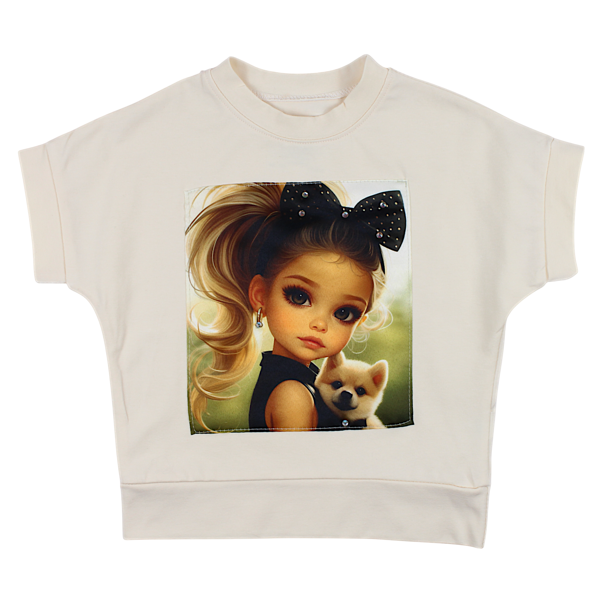Beautiful cream-colored Guliwerkids blouse for girls, perfect for the spring-summer season. Enriched with a charming, colorful print on the front, which shows a character with a dog. The blouse has short sleeves and a classic cut without fastenings, which ensures comfort of wearing. Perfect for everyday styling for girls who value comfort combined with fashionable design.