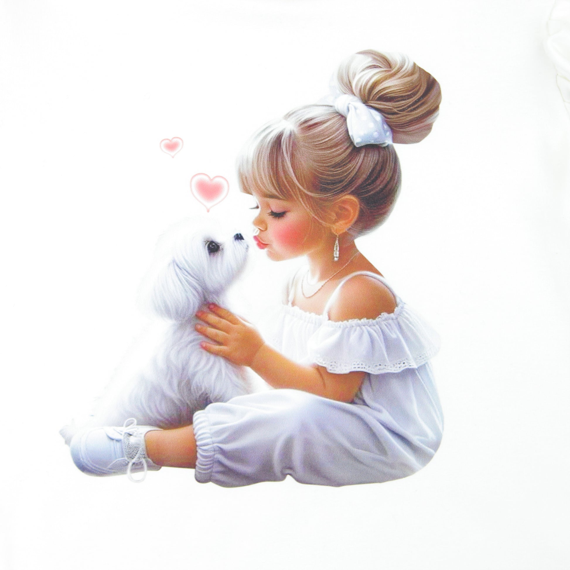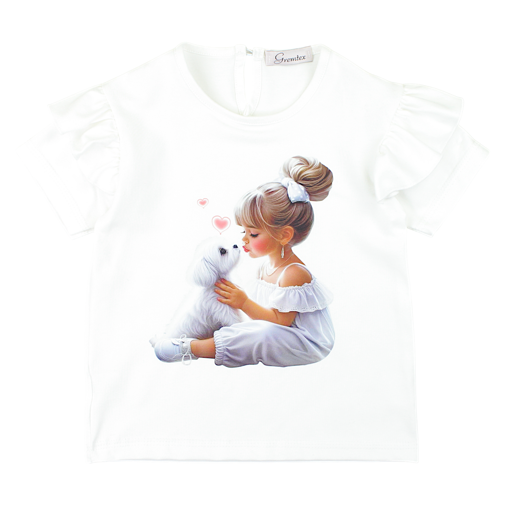 A charming blouse for girls in a light shade of beige, decorated with a unique print of a girl with a dog. The model is made of soft cotton , ensuring comfort of wearing all day long. Short sleeves with frills add a girlish charm to the whole. The blouse has a round neckline and a button closure at the back , making it easy to put on. Perfect for spring and summer , it goes perfectly with both pants and skirts.