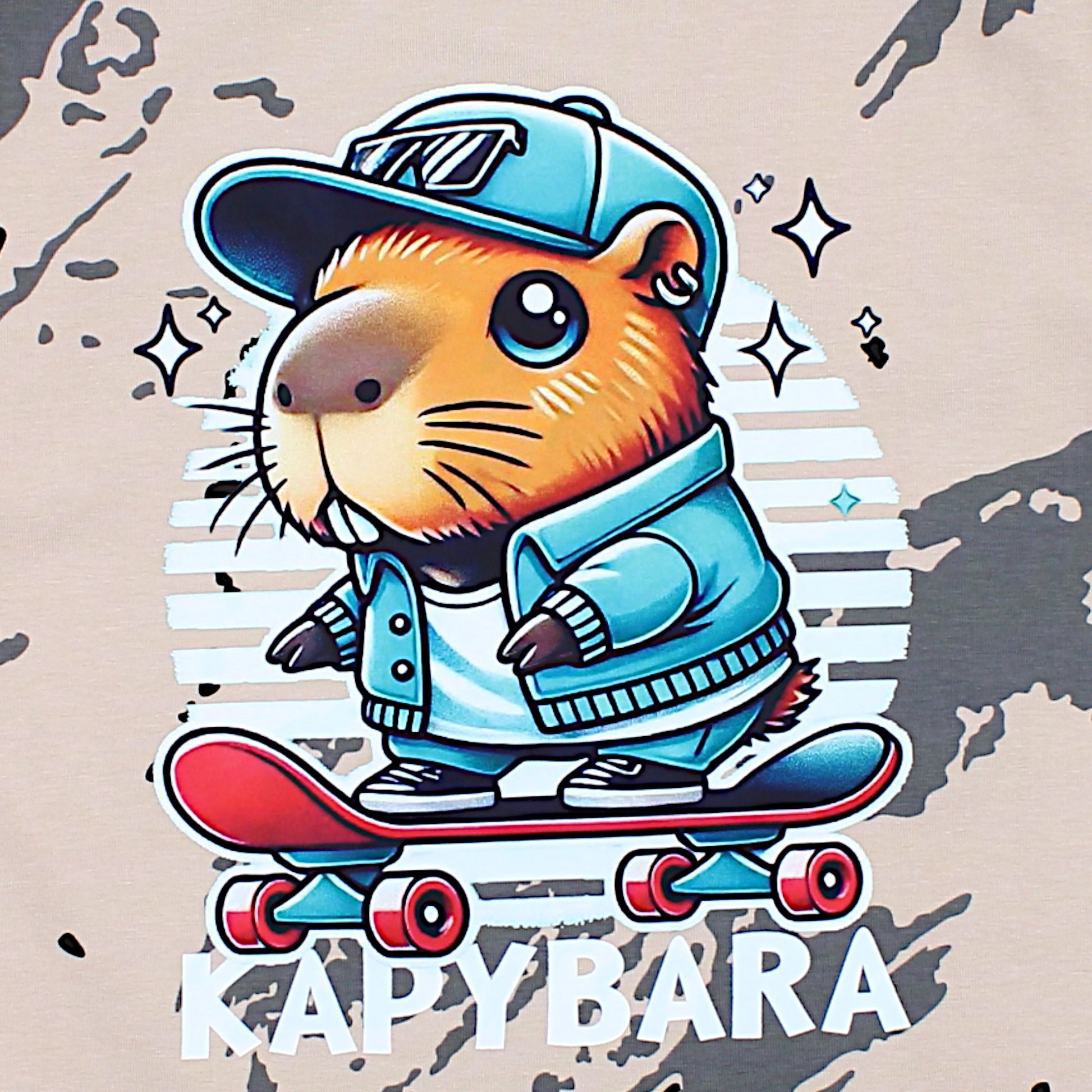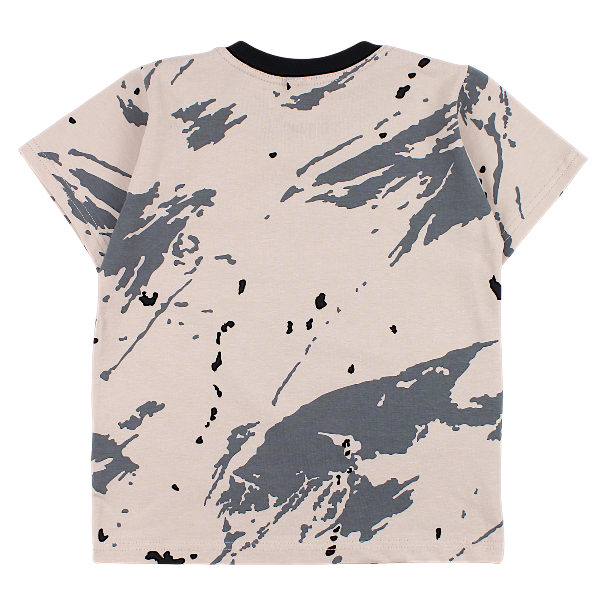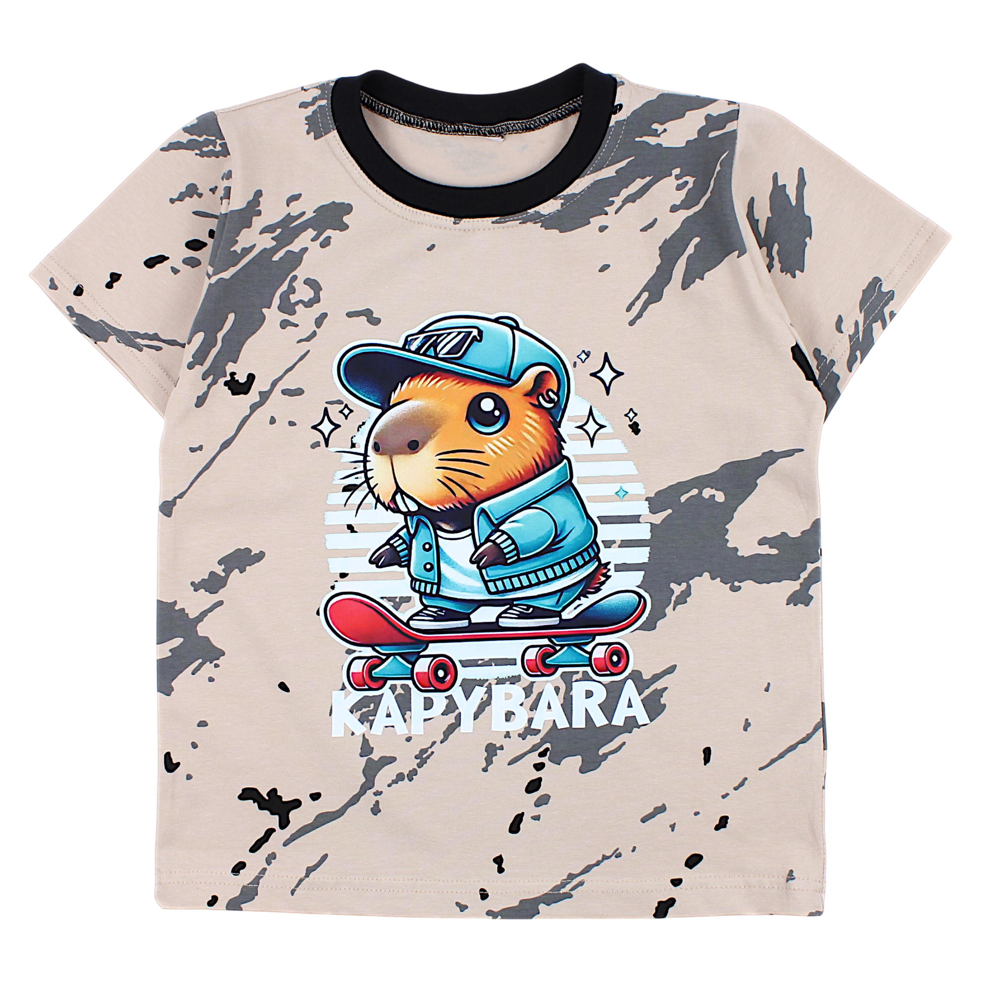 Boys' beige blouse with a distinctive print of a figure on a skateboard. It has short sleeves and a round neckline with black piping. Made of soft, skin-friendly cotton . Perfect for the spring-summer season.