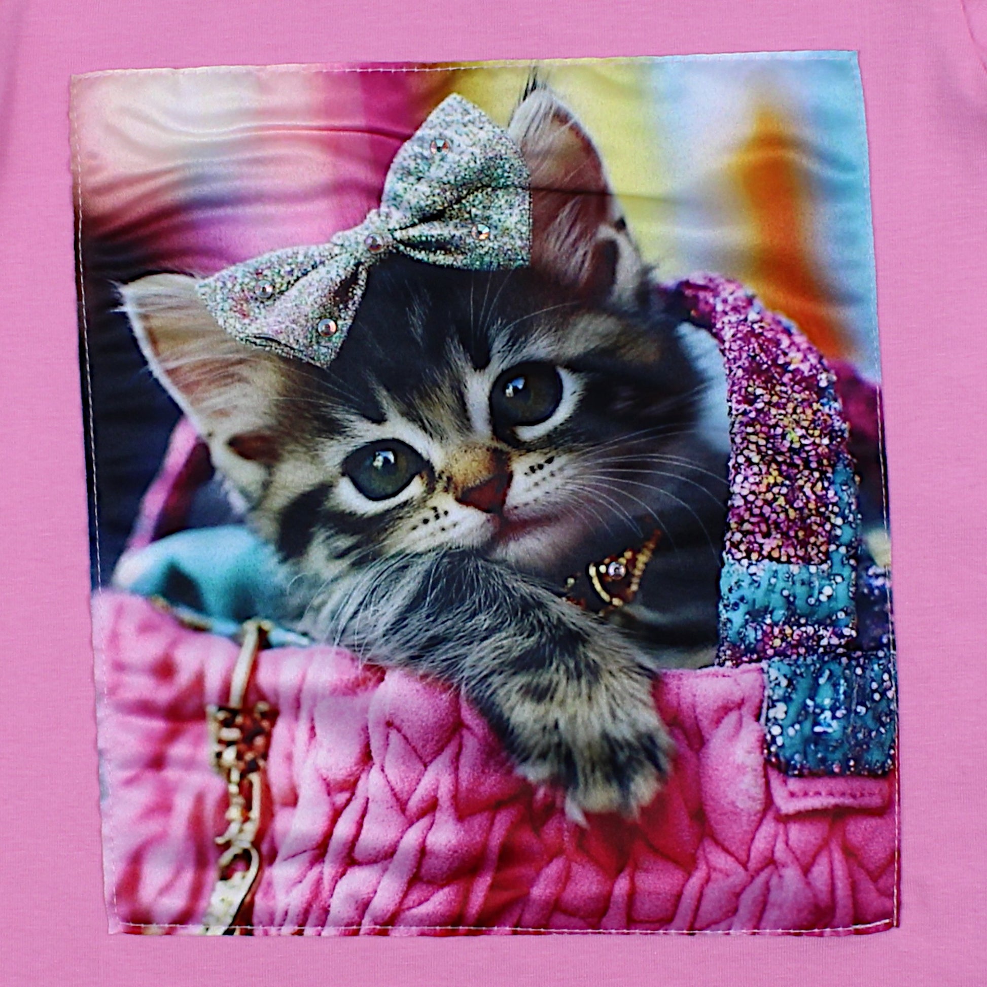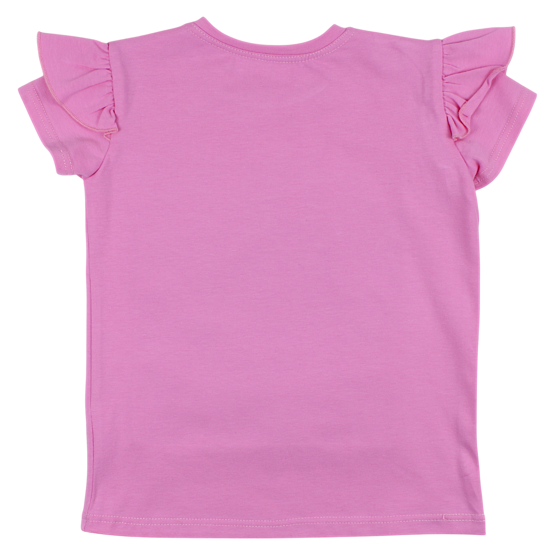 A lovely blouse for girls in pink , decorated with a graphic of a cat in a beautiful bow. Finished with frills on the short sleeves , which adds to its extraordinary charm. On the front there is a colorful print that attracts attention. The blouse is perfect for spring and summer days. No pockets or fasteners, which ensures comfort and freedom of movement.
