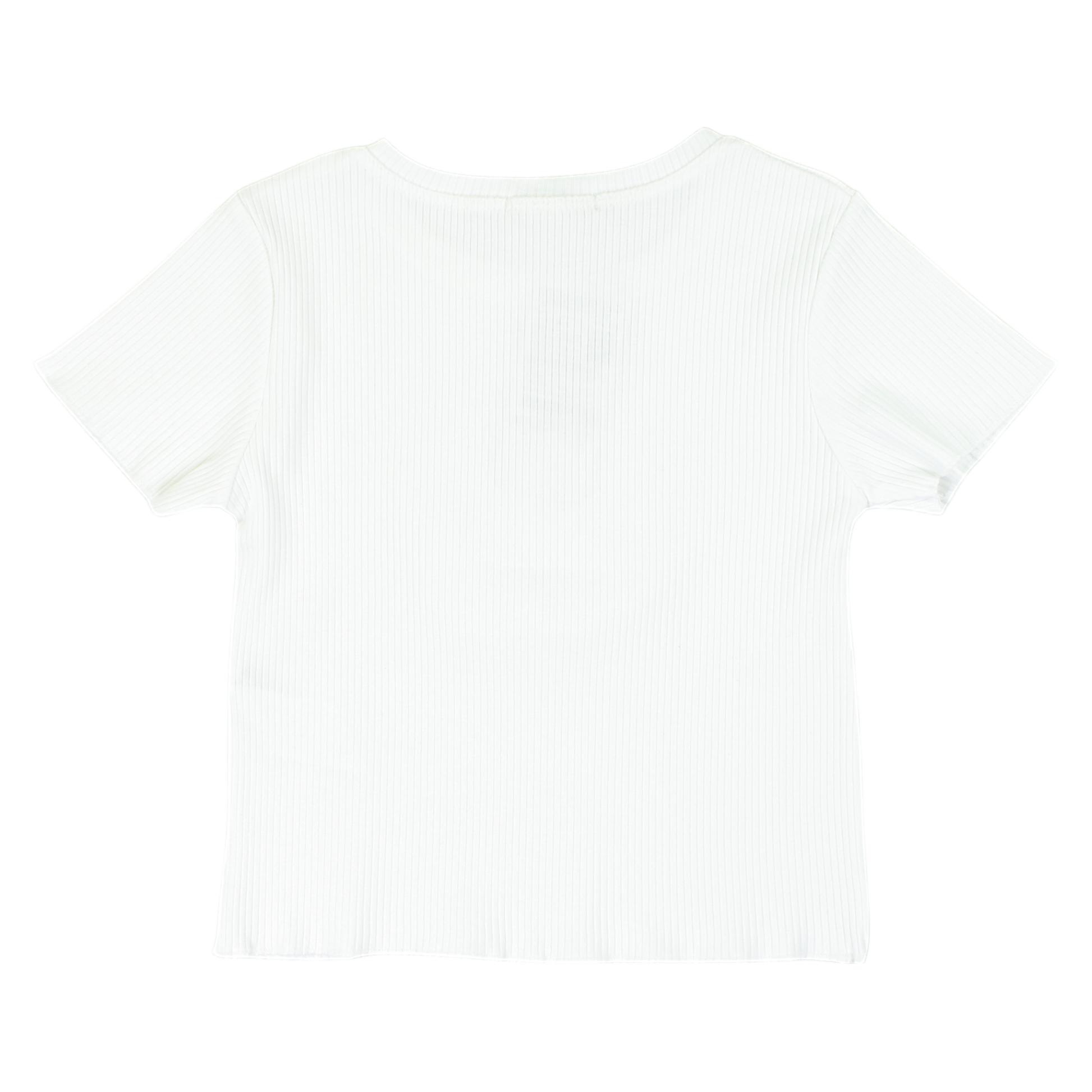 Beautiful girly blouse with short sleeves , made of ribbed cotton in a delicate cream shade. In the middle decorated with an embroidered flower with pearls and sequins , which adds to its subtle charm. The elastic material ensures comfort of wearing, and the classic cut makes the blouse suitable for both everyday stylings and more elegant occasions. Perfect for skirts, leggings or trousers .