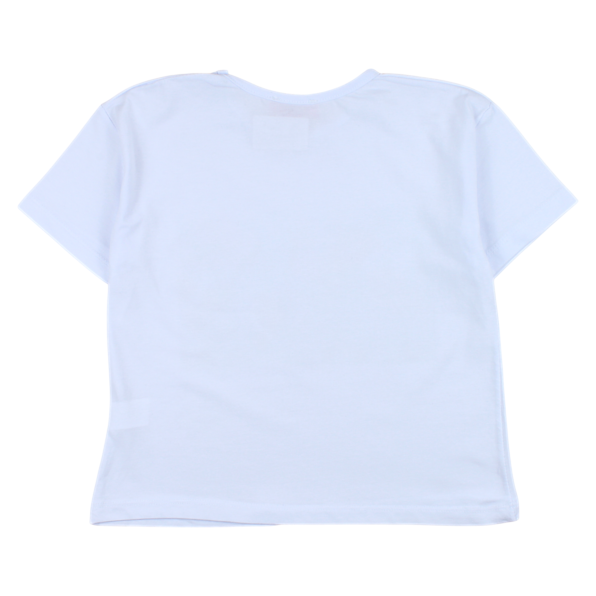 Girls' white blouse with a floral print , perfect for young fashion lovers. Made of pleasant to the touch material, it provides comfort when worn. Oversize cut with short sleeves makes it a great choice for warm days. No pockets, solid back. The print is colorful and eye-catching, giving the blouse a unique character. The product has no fasteners, which makes it easy to put on. Perfect for spring and summer.