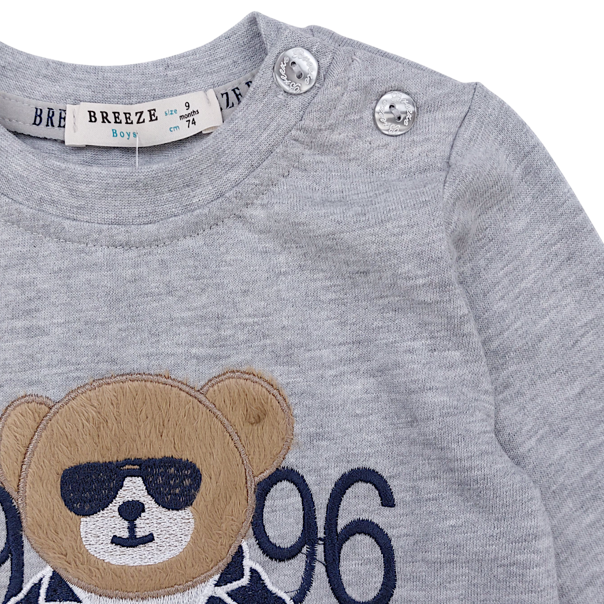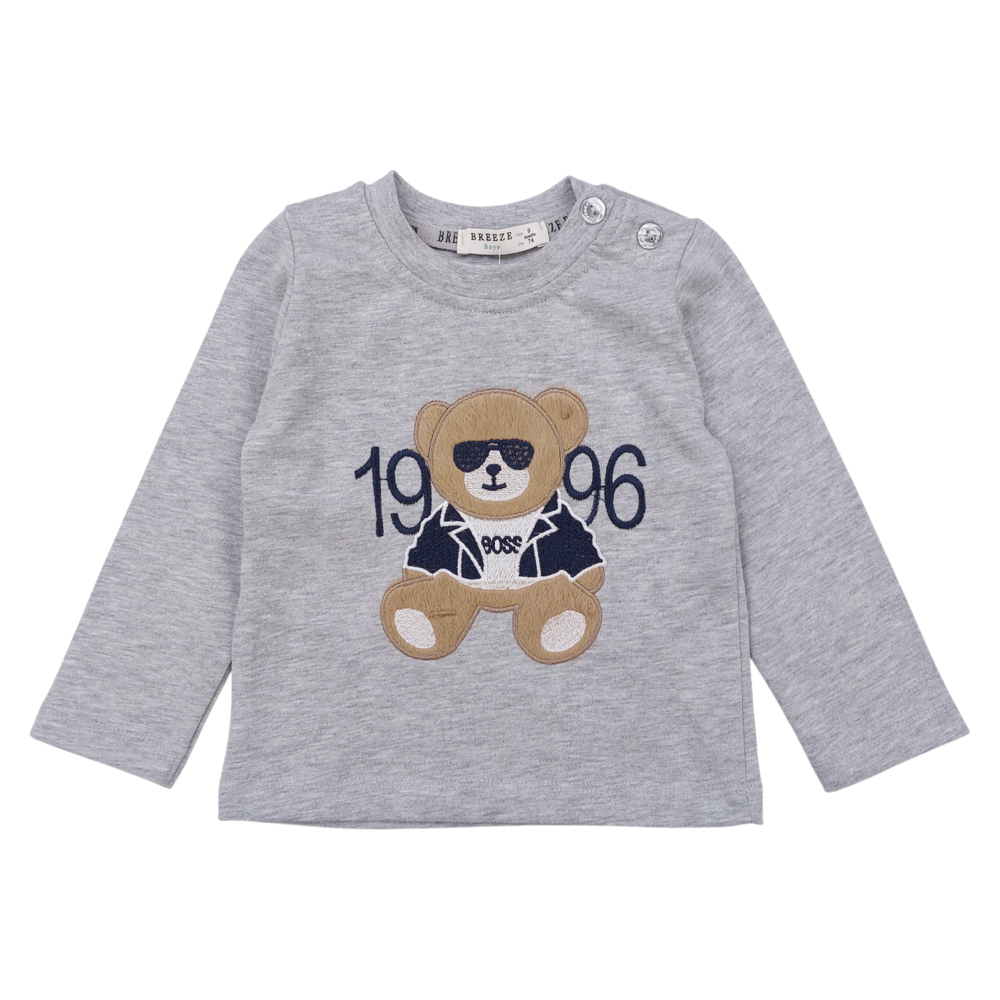 A lovely boy's blouse in grey , with long sleeves and an application of a bear with glasses with the inscription "1996". Equipped with a comfortable clasp on the shoulder for easy putting on. Perfect for the spring-summer season.