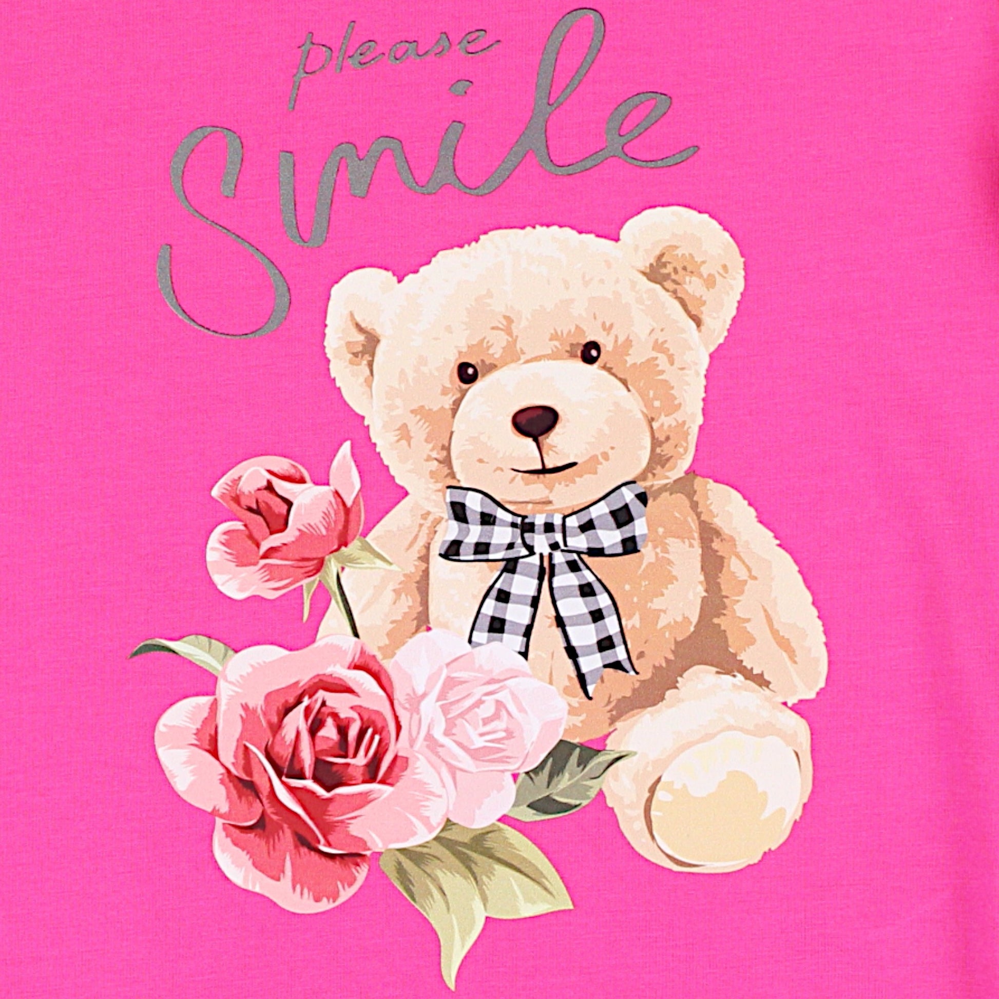 The blouse is decorated with a charming print depicting teddy bear with a bow and flowers, which gives it a girlish character. This motif fits perfectly with fashionable stylings, creating sweet and elegant look . Delicate inscription please smile adds a unique charm and positive message.