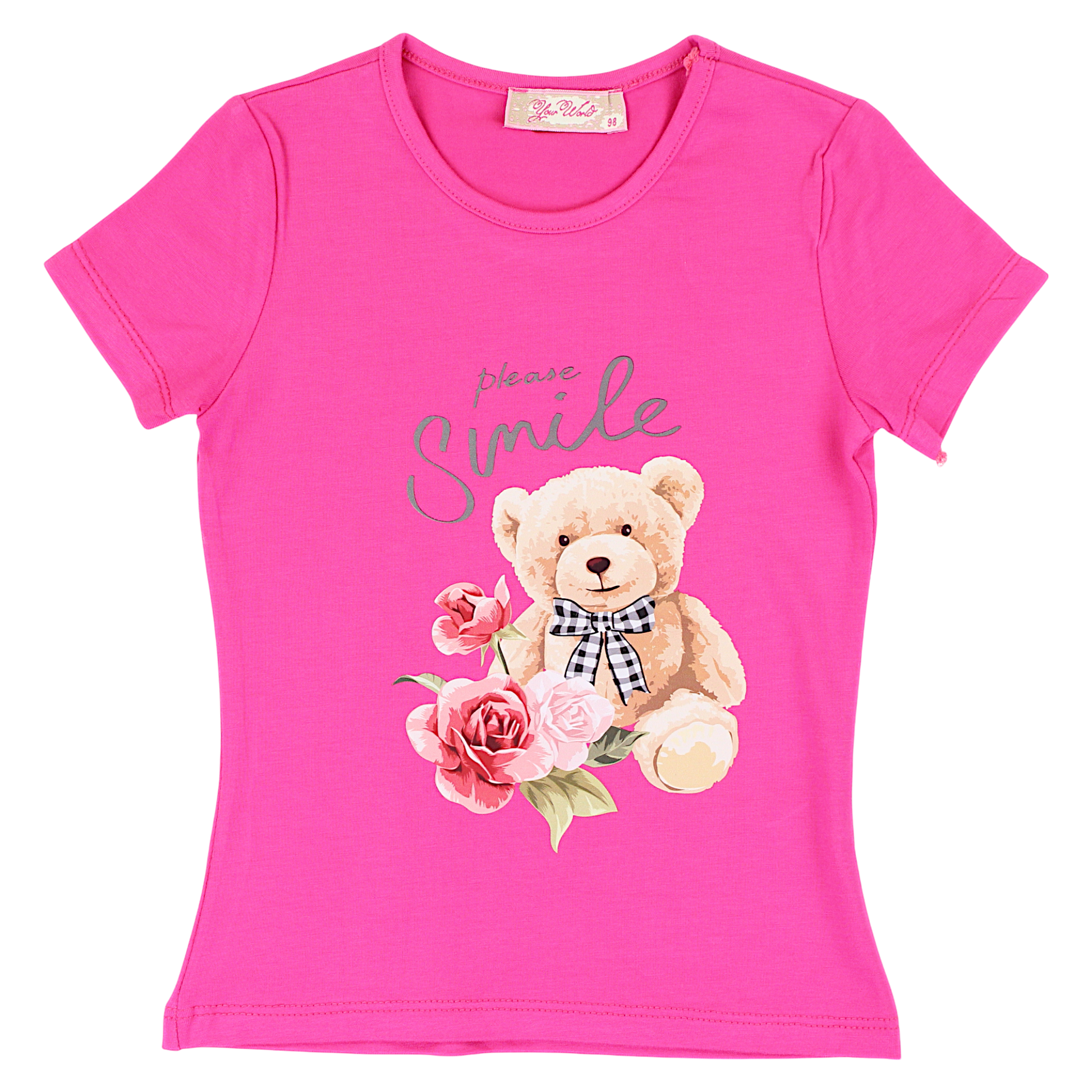 Girls' short-sleeved blouse in an intense shade of fuchsia. Made of soft cotton , it provides comfort when worn every day. On the front there is a charming print of a teddy bear with a bow, surrounded by flowers and the inscription please smile , which adds a girlish charm to the whole. The round neckline makes the blouse easy to put on, and the elastic material adapts to the child's figure. Perfect for summer styling, fits both trousers and skirts .