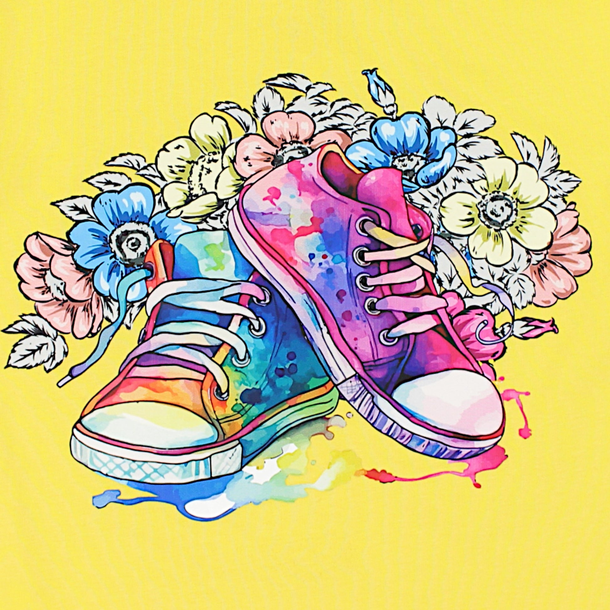 Add a touch of fun to your child's wardrobe colorful joy with a unique girly blouse with sneakers ! This fashionable blouse for girls In sunny shade of yellow it's a great choice for spring and summer styles . Thanks short sleeve and loose fit , the clothes are comfortable and airy, perfect for warm days .