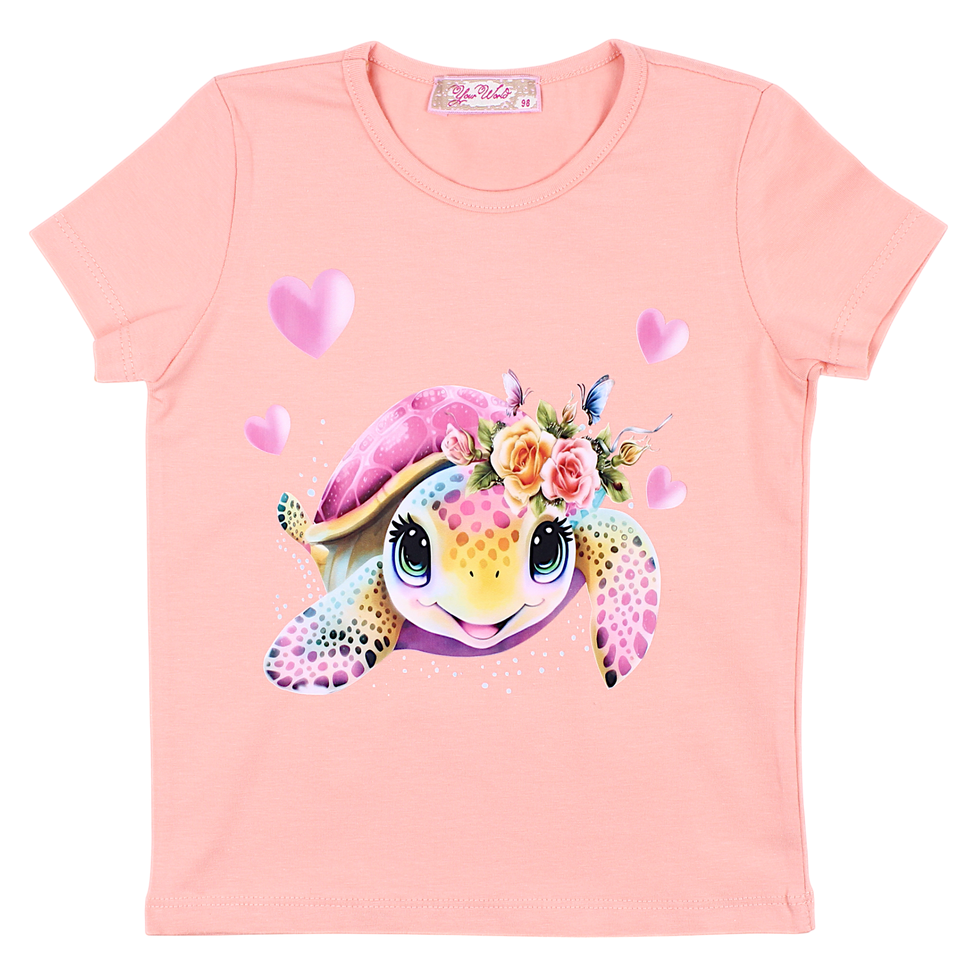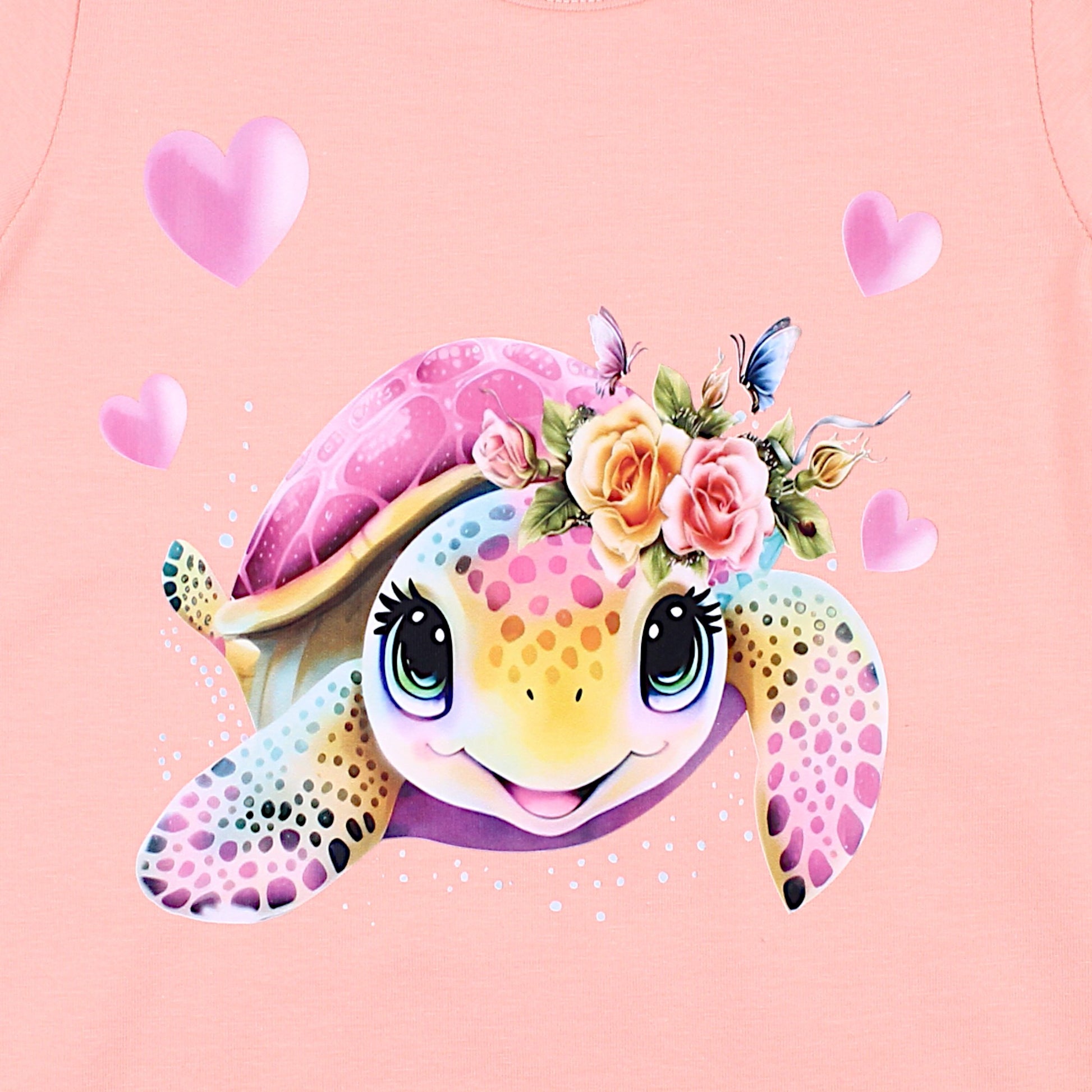 This girly blouse in apricot color attracts with a charming print of a cheerful turtle decorated with flowers and butterflies . Perfect for sunny days, made of soft material. Short sleeves and a round neckline ensure comfort of wearing. No fastenings, which makes it easy to put on and take off.