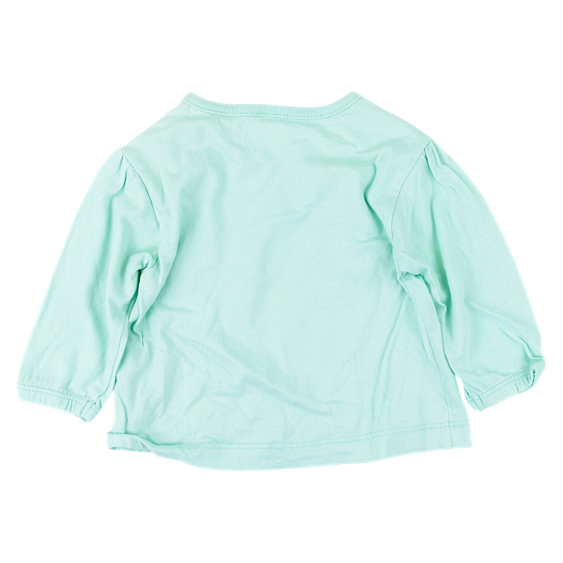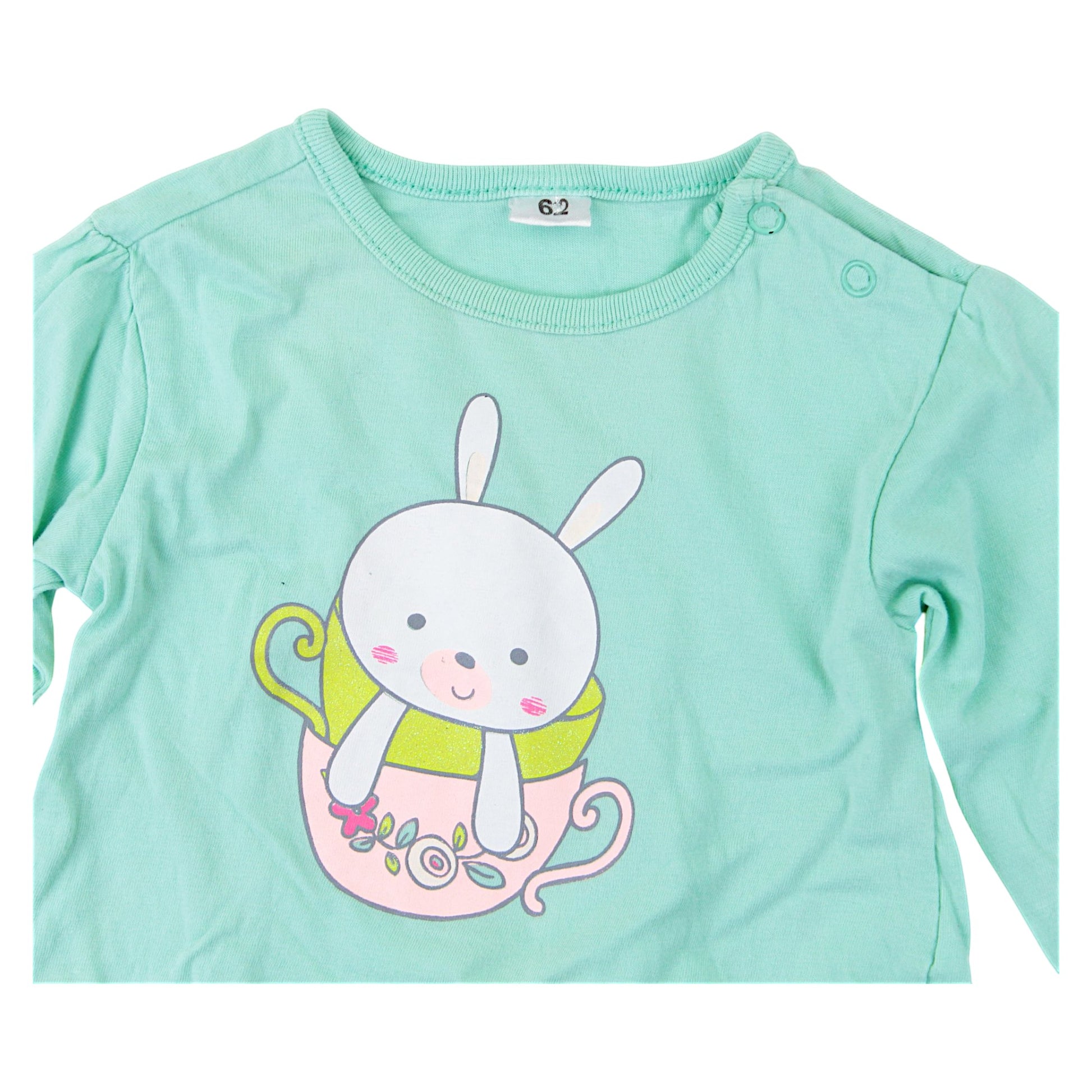 A lovely long-sleeved blouse for girls, decorated with a print of a bunny sitting in a cup. A mint-coloured blouse with delicate ruffles on the shoulders. It has a practical button fastening on the shoulder , which makes it easy to put on and take off. Perfect for everyday wear and special occasions.