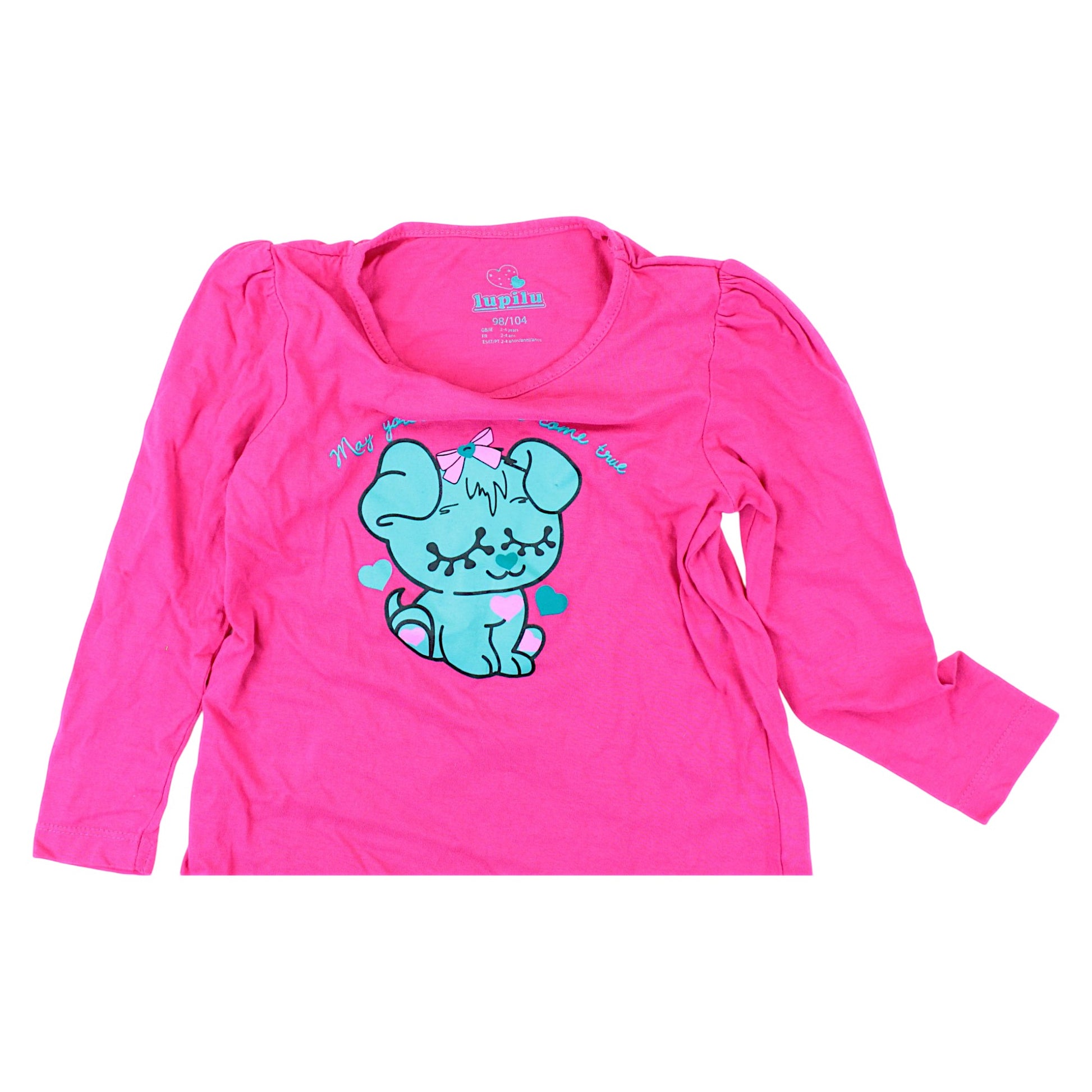 A lovely long-sleeved blouse for girls with a dog motif by Lupilu . Made of soft material, perfect for the spring-summer season. The pink color gives it a girlish charm, and the sweet dog print with the inscription "May your dreams come true" adds a unique character. The blouse has a round neckline and long sleeves with delicate ruffles at the shoulders, which emphasizes its girlish style. Perfect for everyday styling for a little animal lover.