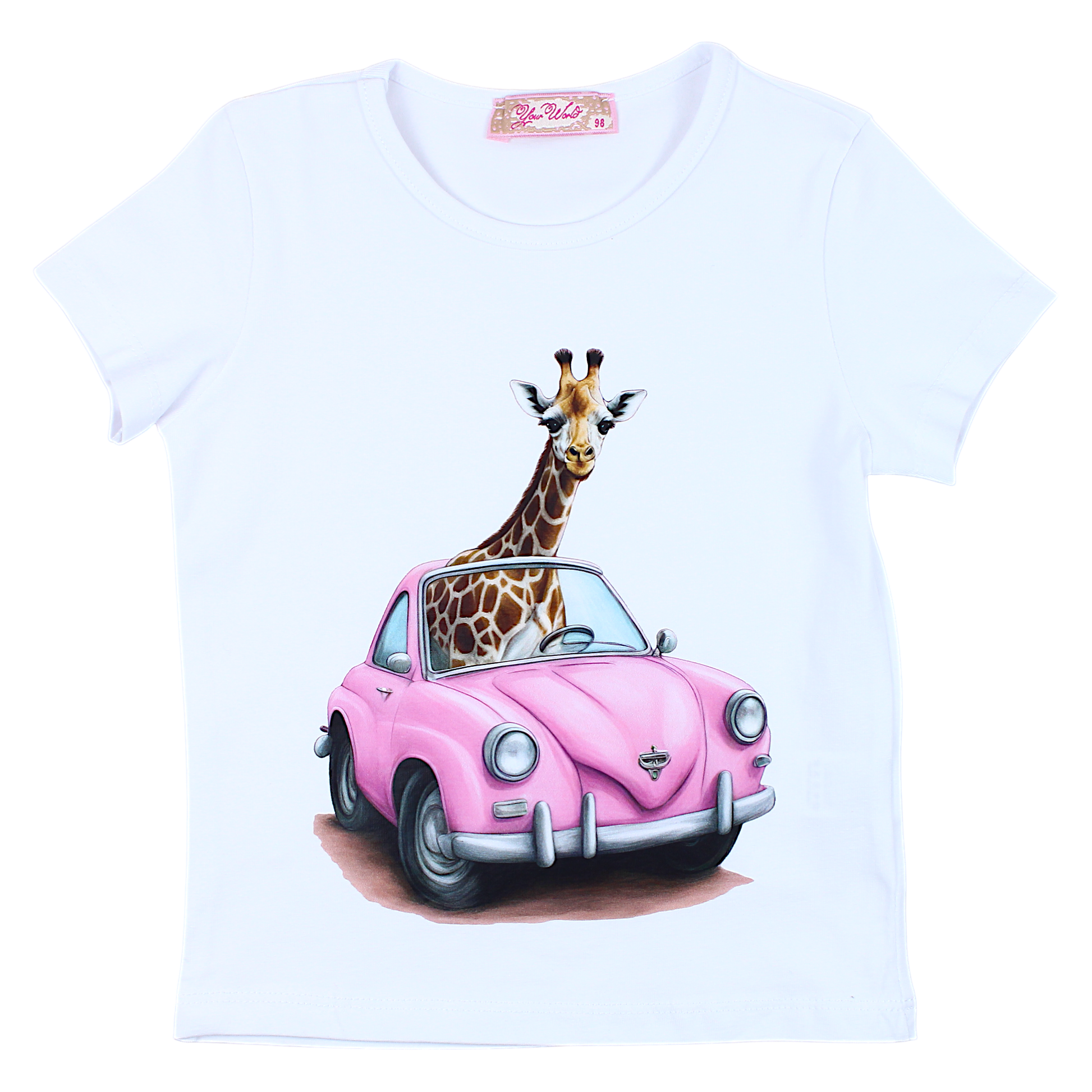 A blouse with a giraffe in a car motif for a girl