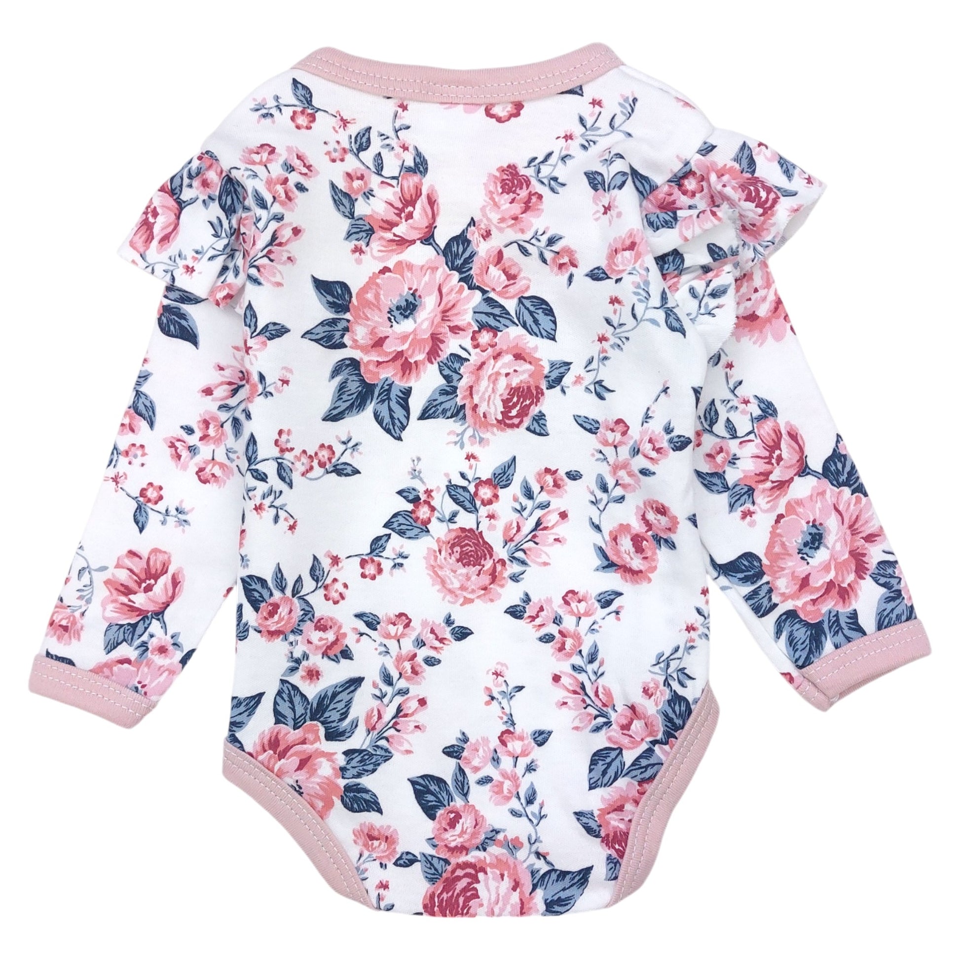 Delicate baby bodysuit with roses Guliwerkids 101-71024 from the autumn-winter season, fastened with snaps at the front and in the crotch, with cute frills on the sleeves. The perfect combination of comfort and style for a girl.