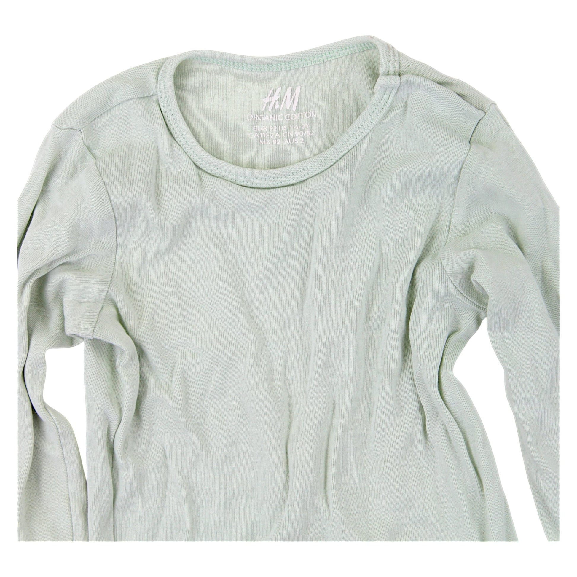 Delicate long-sleeved bodysuit for girls by H&M in a subtle green color . Made of organic cotton , which guarantees maximum comfort and softness for the child's sensitive skin. The bodysuit has a round neckline and snap fastening in the crotch, which makes it easier to change the baby's diaper. The classic cut makes it an ideal base for various everyday styles.