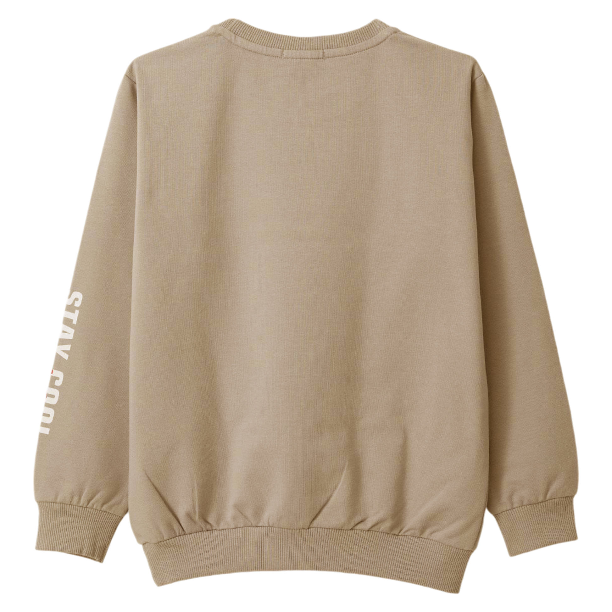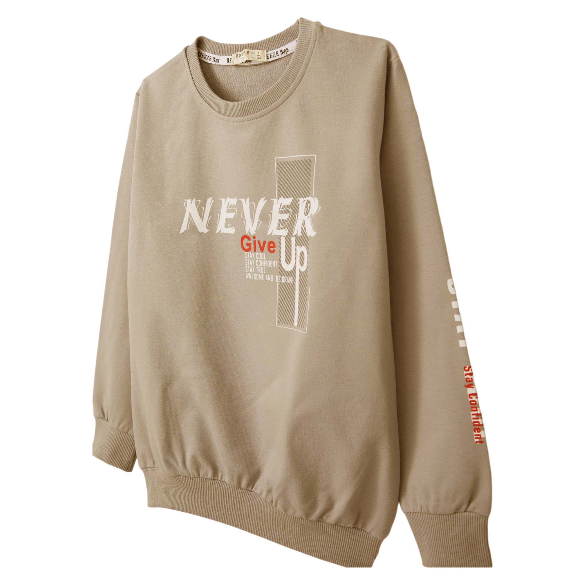 Thin boy's sweatshirt , beige from the autumn-winter collection, with the "NEVER GIVE UP" print and inspiring slogans on the front. Long sleeves decorated with the inscription "STAY COOL" and elastic cuffs on the cuffs and at the bottom provide comfort and style. The sweatshirt is put on over the head , has no pockets or fasteners, which makes it simple and comfortable to use. Perfect for everyday use, light and functional.
