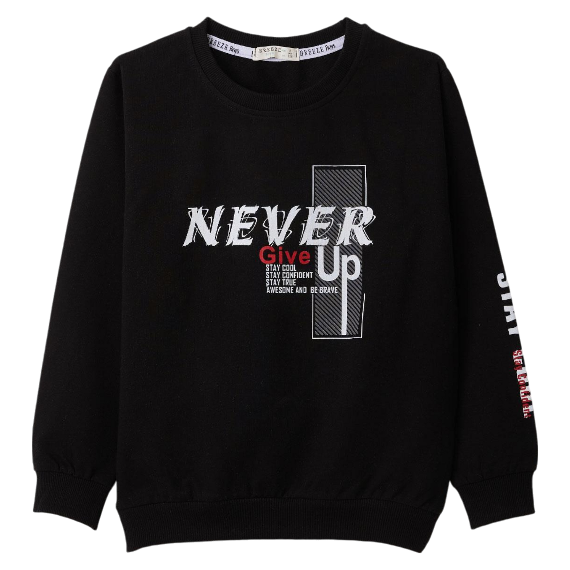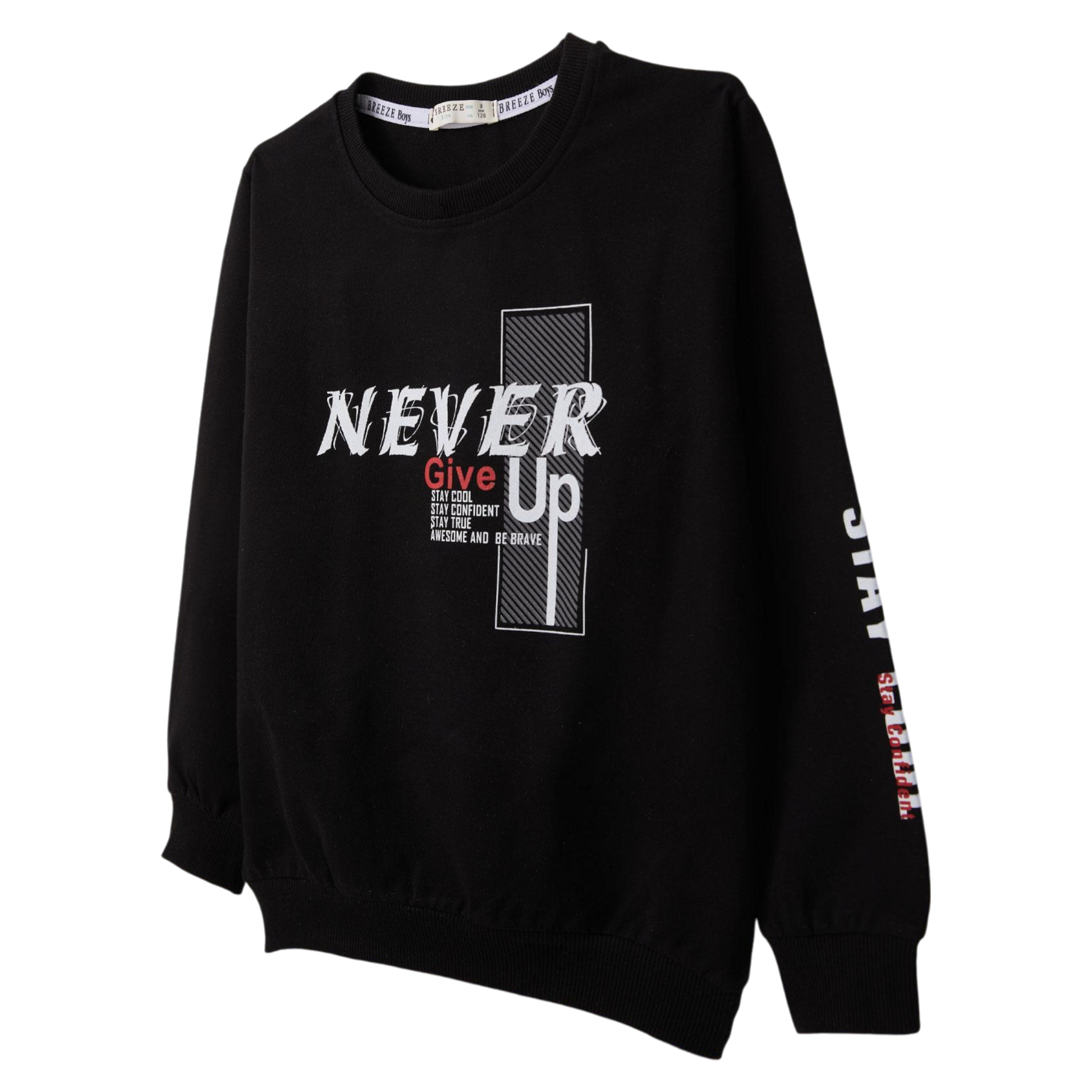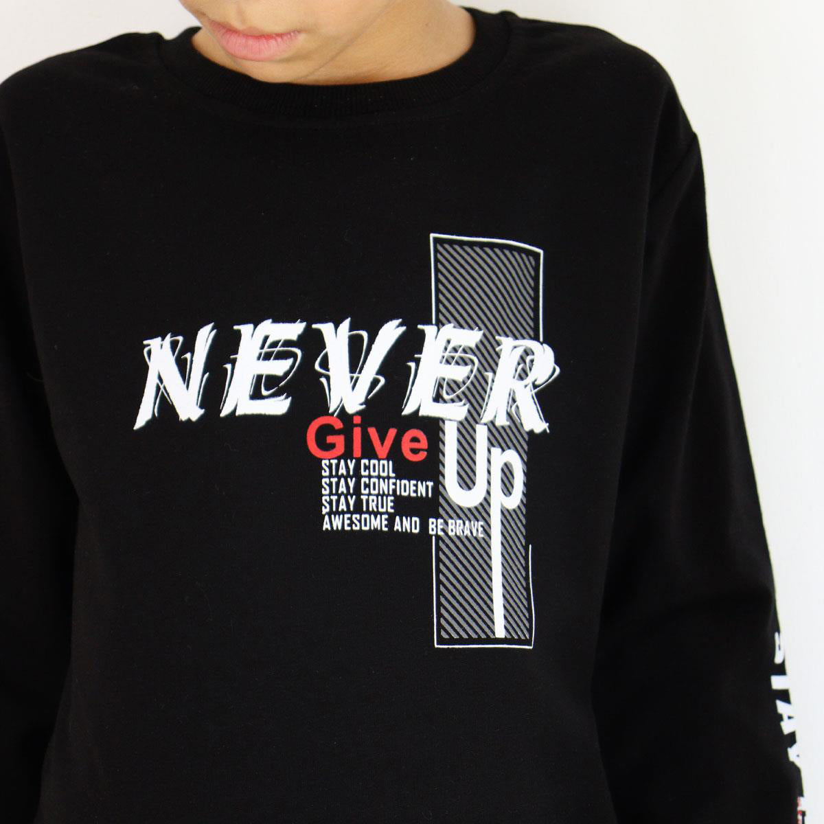 Thin boys' sweatshirt from the autumn-winter collection, black, with the inscription "NEVER GIVE UP" on the front. Enriched with inspiring slogans: "Stay cool, stay confident, stay true, awesome and be brave". Long sleeves with additional "STAY COOL" prints on the sleeves add a sporty character. Perfect for colder days, light and comfortable. The lack of pockets and fasteners makes the sweatshirt easy to put on, and elastic cuffs on the sleeves and at the bottom ensure comfort.