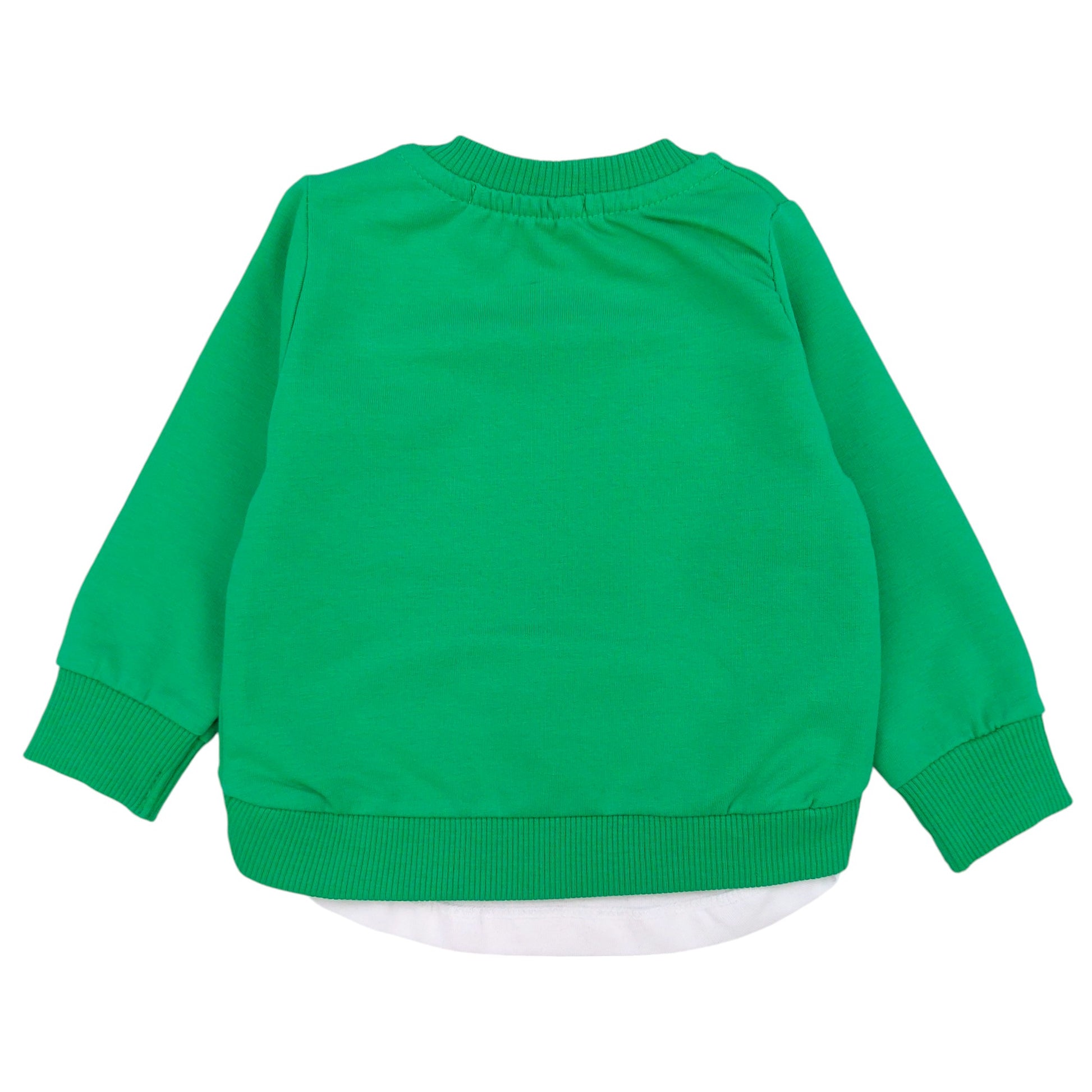 The green sweatshirt with a funny bear print has a button closure on the side, which makes it easy to put on and take off. It is also finished with elastic bands, which ensures a good fit.