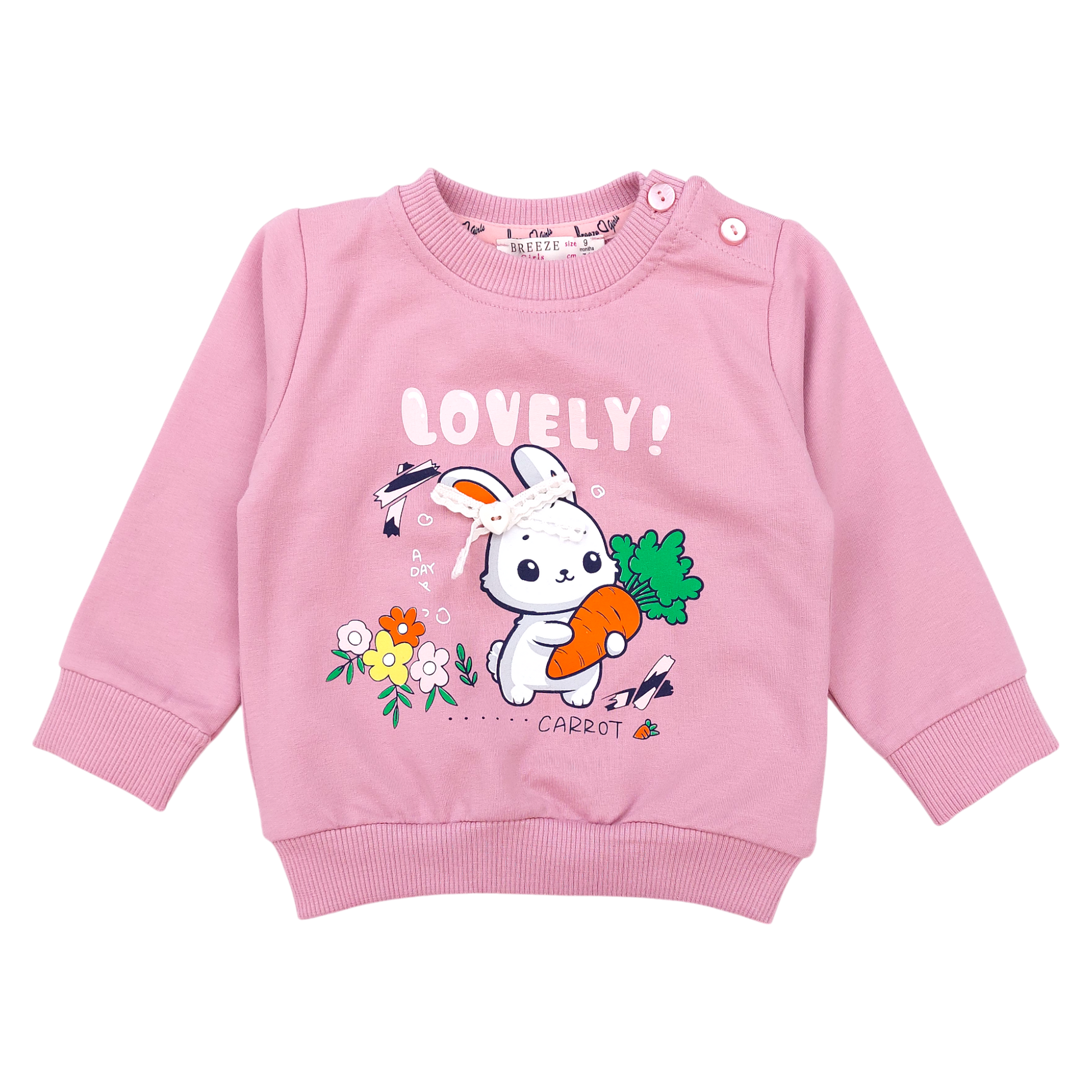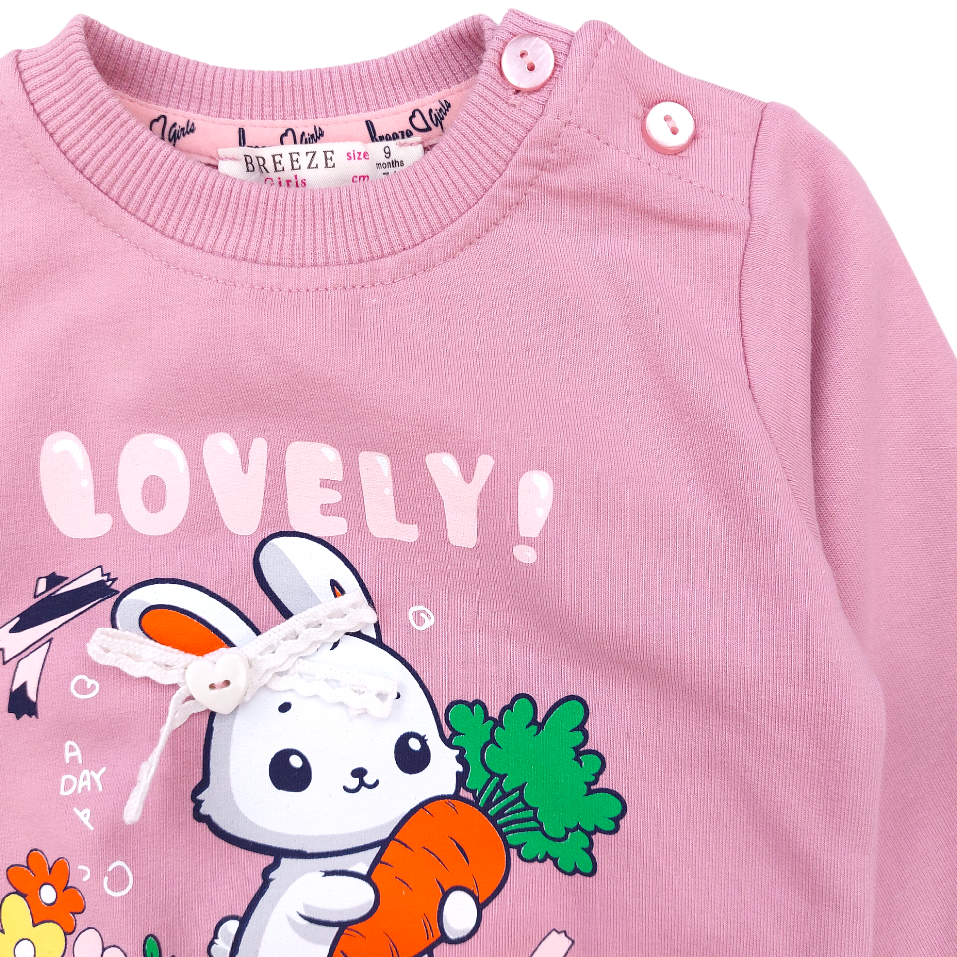 Cute Breeze Girls Tracksuit is the perfect set for every little princess who values comfort and style. A long-sleeved sweatshirt made of high-quality cotton with added elastane, provides comfort and the right elasticity. It is distinguished by a beautiful print of a bunny holding a carrot and the inscription "Lovely!", which adds charm to the sweatshirt. Practical shoulder fastenings make it easier to put on and take off the sweatshirt, which is particularly convenient in everyday use.