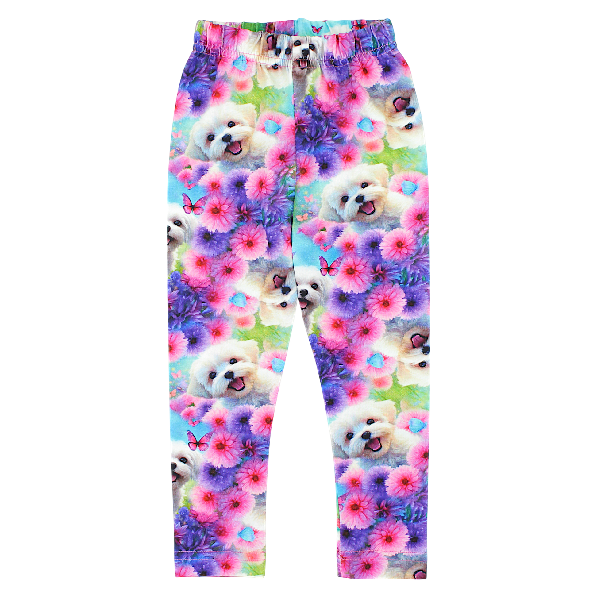 These adorable children's pants feature adorable Maltese dogs surrounded by flowers, perfect for spring and summer days. The pants are made of lightweight fabric, which ensures comfort even during active play. The elastic waistband ensures a perfect fit, while the lack of pockets and fasteners makes it easier for children to dress themselves.