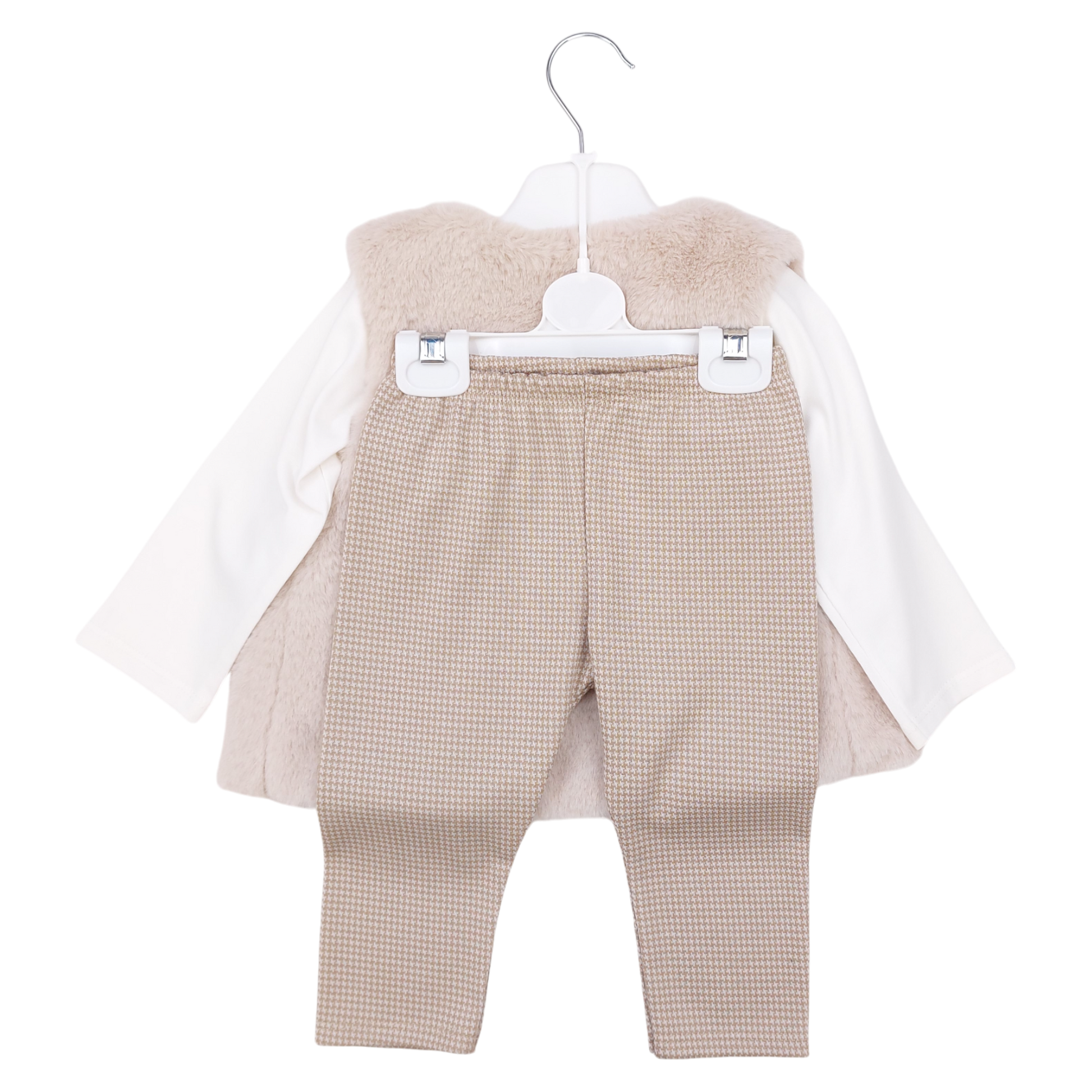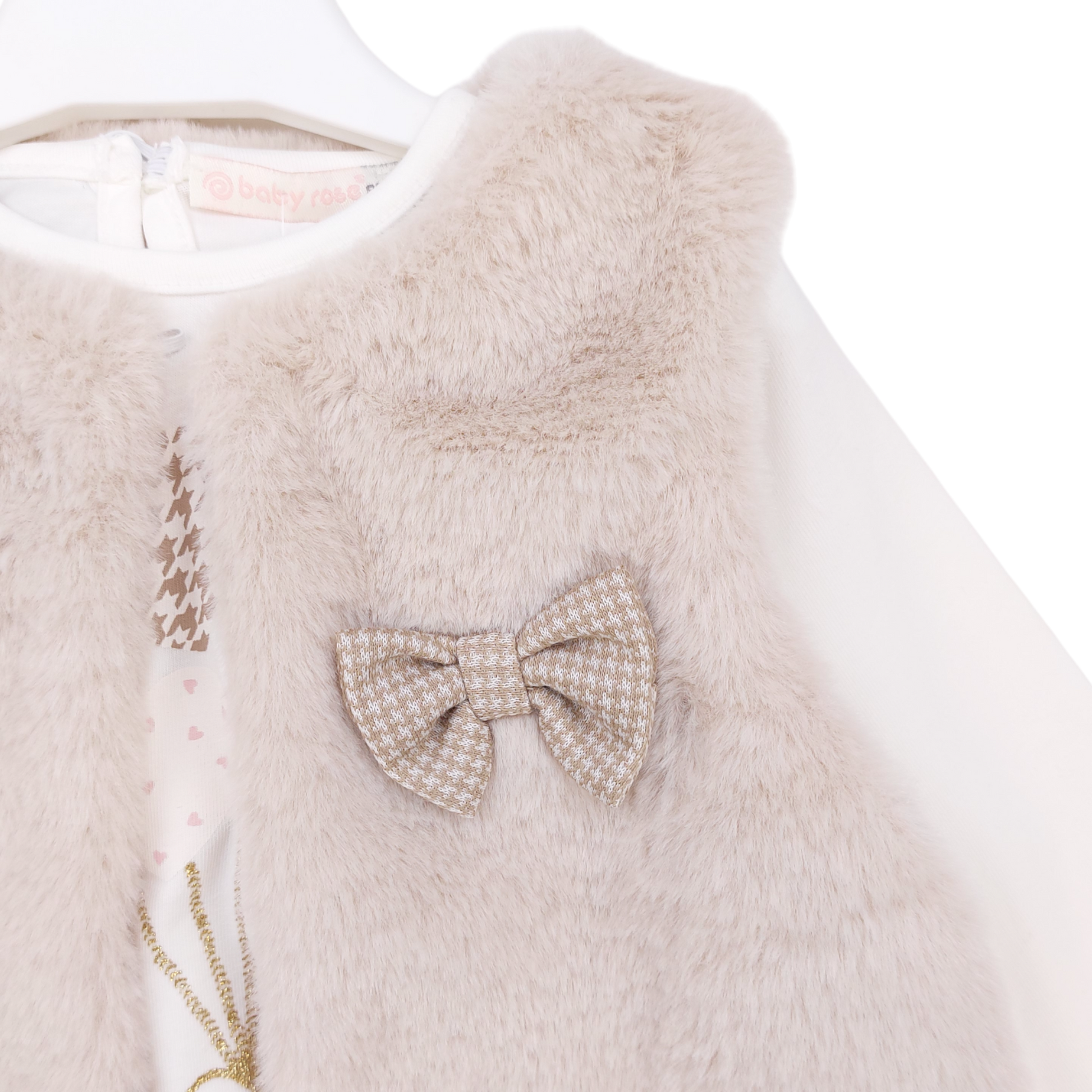 Girls' set Baby Rose is an elegant set for the season autumn-winter , which is perfect for everyday and more formal stylings. It consists of three parts: beige waistcoat , white long sleeve blouses and comfortable leggings . The vest is made of soft, furry material, which not only provides warmth but also adds an elegant look to the set. The decorative bow on the vest adds a girlish charm and makes the set look exceptionally stylish. Thanks to this element, every little girl will feel fashionable and comfortable.