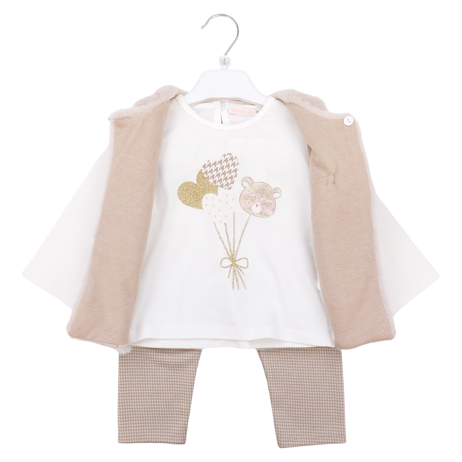 A charming set for a girl consisting of three parts: a soft, beige vest with a decorative bow, a white blouse with long sleeves and patterned leggings. Perfect for the colder days of the autumn-winter season. The vest has a pleasant, furry material that provides warmth and adds elegance. The blouse is decorated with a charming print with an animal motif and hearts, which gives it a unique character.