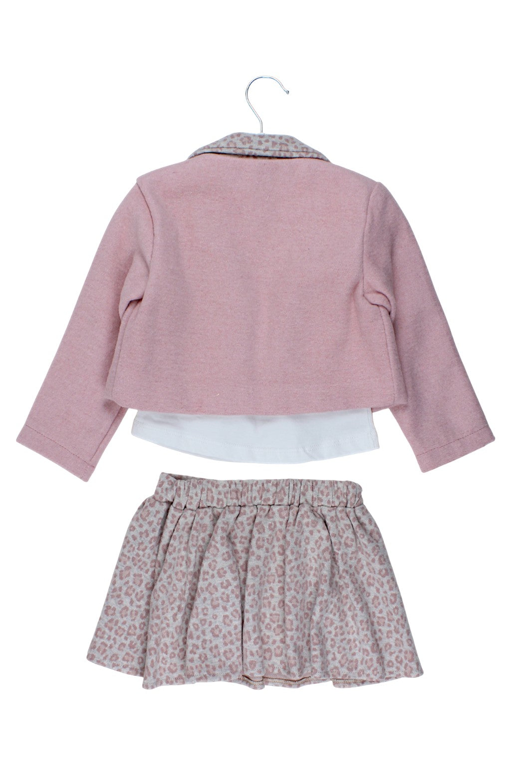This powder pink set for girls is the perfect choice for the fall and winter season. The set consists of three pieces: an elegant blazer , a stylish skirt , and a comfortable blouse . The blazer features a subtle leopard print, adding character. The skirt is designed for comfort and freedom of movement. The blouse, made of soft cotton, provides warmth and comfort. The whole creates a harmonious ensemble that's perfect for a variety of occasions.Composition: blouse 97% cotton 3% lycra jacket 70% cotton 30% polyester skirt 57% polyester 30% cotton 3% lycra and viscose