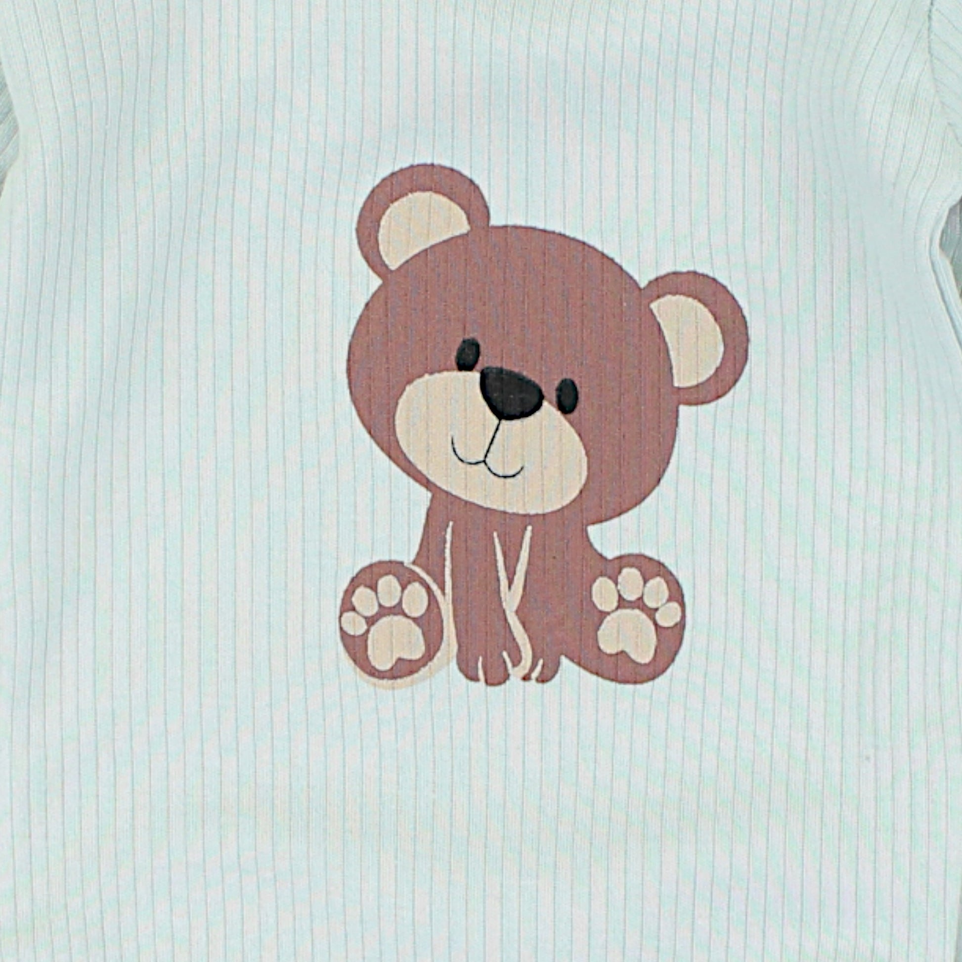 A charming baby set consisting of a long-sleeved bodysuit and a half-sleeved romper in a pastel, mint color. The bodysuit is fastened with snaps on the shoulder and in the crotch, which makes it easier to change and dress the baby. There is a sweet teddy bear print on the front, and the half-sleeved romper is decorated with a pattern of small teddy bears that add charm. Made of delicate, breathable cotton , which is safe for the child's sensitive skin. The perfect choice for spring and summer - both for sleeping and everyday play.