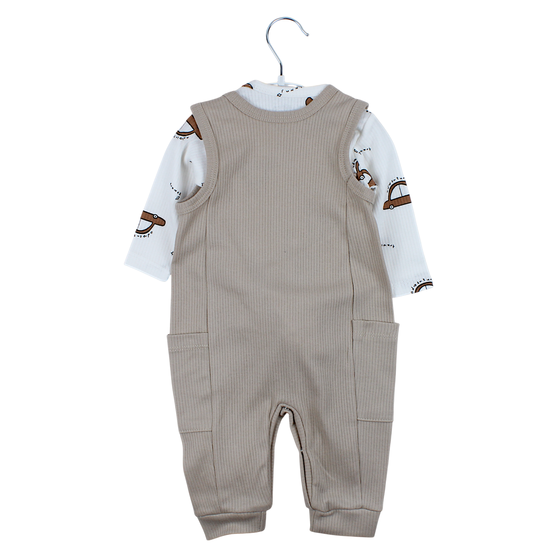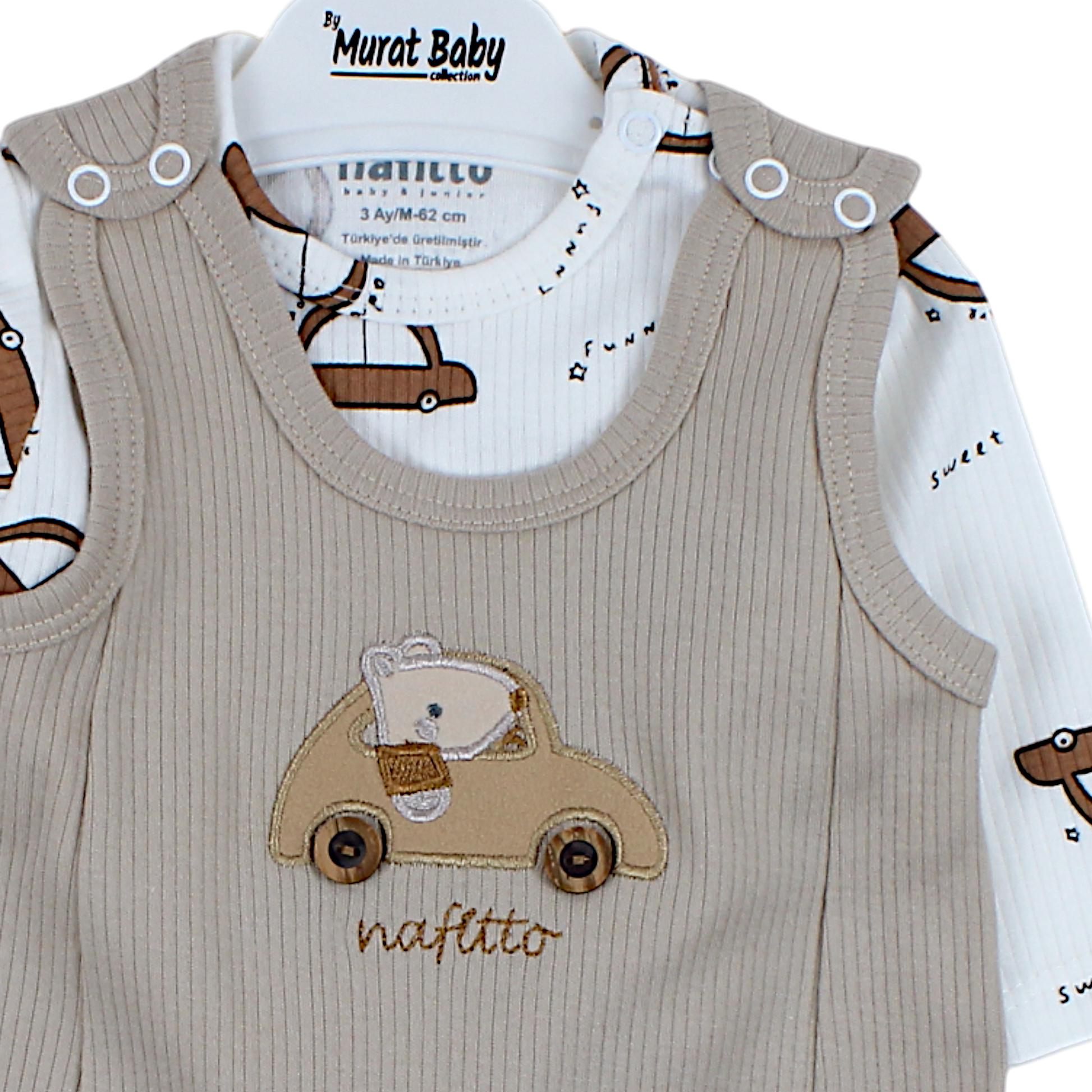 We present a stylish set for a boy from Nafitto, designed for the spring-summer season . The set consists of three elements: a bodysuit, shorts and socks. The bodysuit made of delicate cotton has long sleeves and a charming pattern depicting cheerful teddy bears in cars. Practical snaps placed on the shoulders ensure easy putting on. The shorts are a classic proposition with wide suspenders that can be adjusted thanks to the snaps. On the front of the shorts there is an application with a teddy bear in a car motif and two small pockets . Delicate socks complete the whole, providing the toddler with maximum comfort. Made of high-quality materials, the set is ideal for children, especially for boys who value comfort and style. The beige color adds versatility, perfectly matching a variety of accessories.