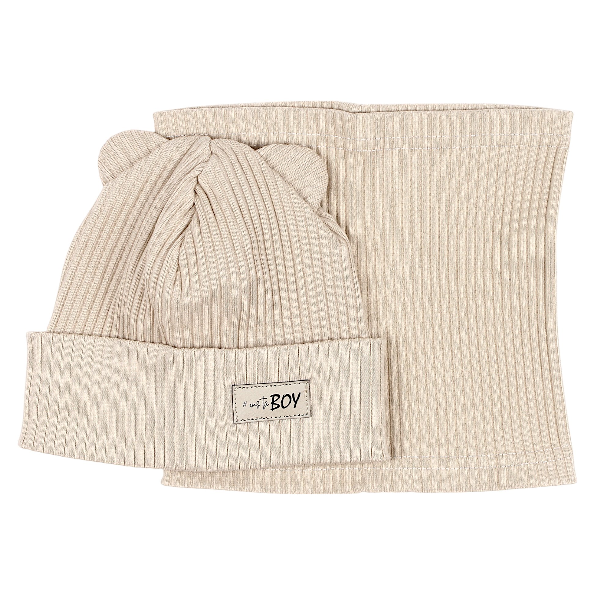 The perfect set for colder days , consisting of a soft, ribbed hat with cute bear ears and a neck warmer that protects the neck . Made of elastic cotton , it guarantees comfort and breathability , making it ideal for spring and summer days. The fashionable beige color perfectly matches various styles.