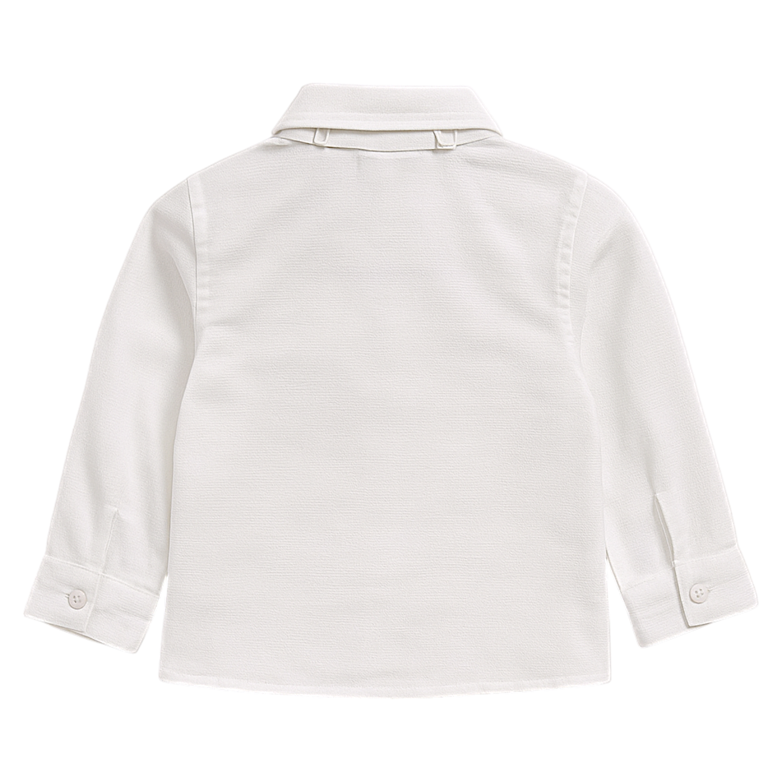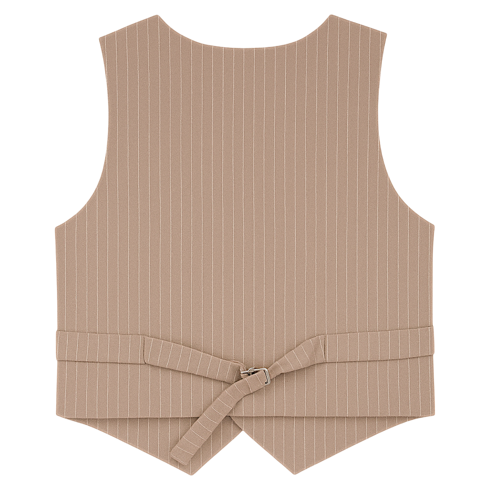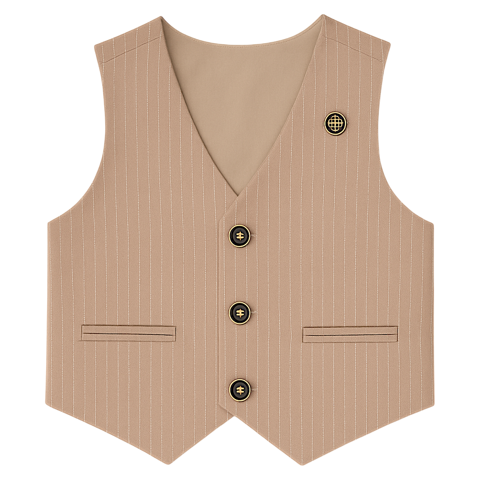 This elegant beige boys' set is perfect for special occasions. It consists of four pieces: a jacket, a vest, trousers, and a bow tie. The jacket and waistcoat are stylishly tailored, and the waistcoat is adjustable at the back for a better fit. The trousers have an elastic waistband for comfort. The elasticated bow tie adds charm and is easy to put on. The entire set is made of child-friendly materials, making it perfect for spring and summer outings.