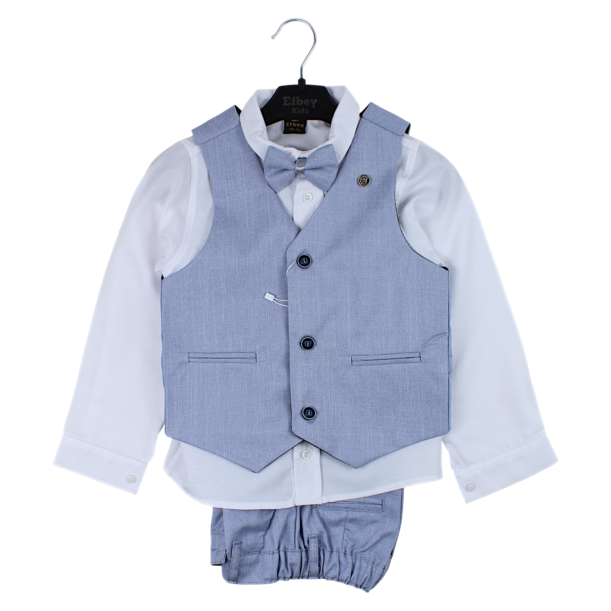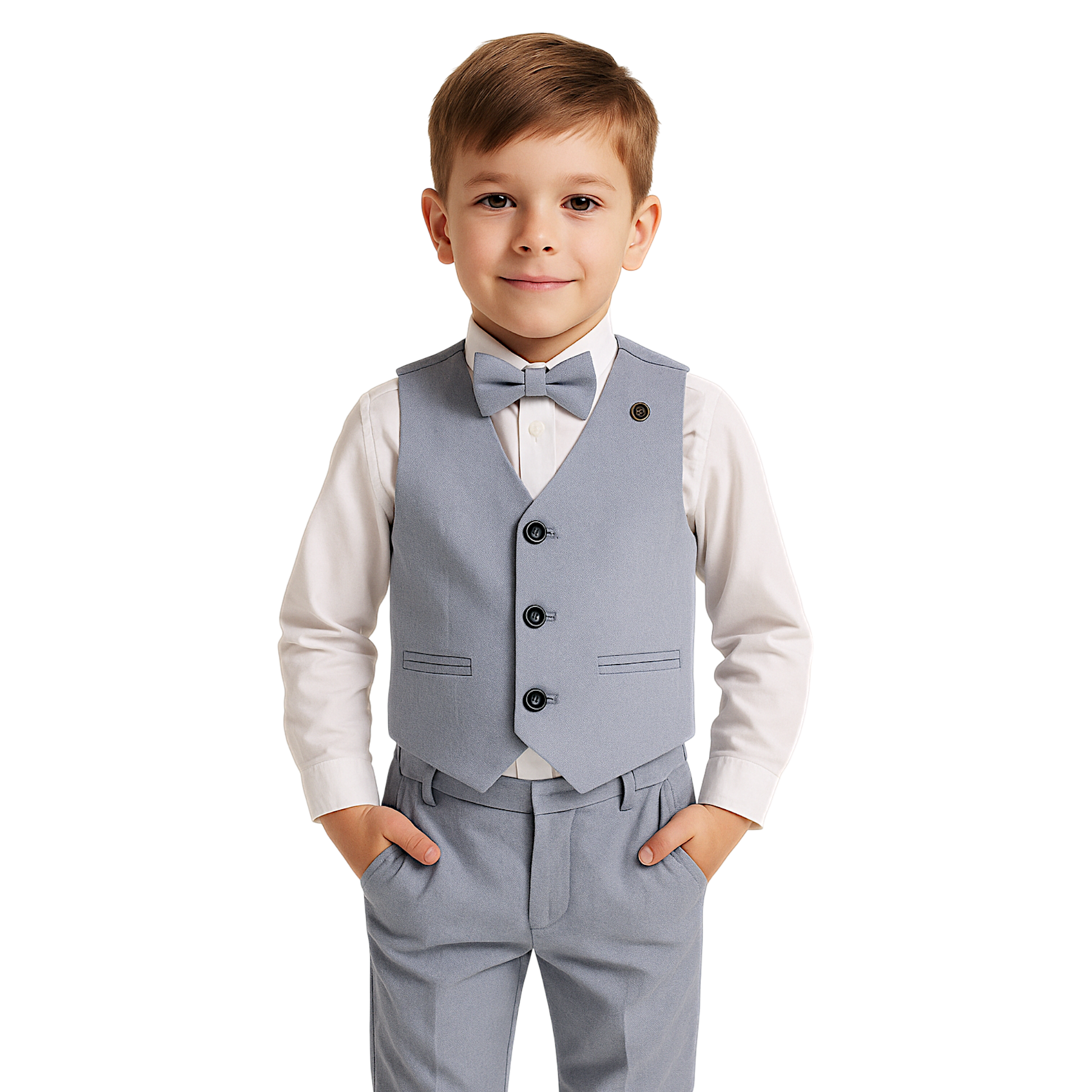 We present an elegant blue boys' suit , perfect for special occasions in the spring/summer season. The set consists of four complementary pieces. It includes an elegant long-sleeved shirt with button-front closure. The vest and trousers add charm and stand out with their classic, clean design. A tasteful bow tie completes the look, lending a sophisticated touch. The set is crafted with attention to detail, ensuring comfort and durability. A perfect choice for little gentlemen.