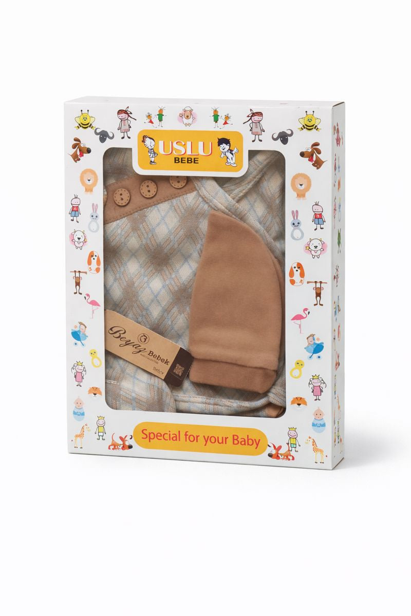 Przedstawiamy chłopięcy komplet wyprawkowy składający się z pięciu części, idealny na sezon jesień-zima. Zestaw w brązowym kolorze obejmuje kaftanik, czapeczkę oraz półśpiochy. Kaftanik posiada wygodne zapięcie na napy, co ułatwia ubieranie malucha. Czapeczka jest elastyczna, doskonale dopasowuje się do główki dziecka, zapewniając ciepło. Półśpiochy mają miękką gumkę w pasie, co zapewnia komfort noszenia. Całość wykonana jest z miękkiej i przyjaznej dla skóry dziecka tkaniny, co czyni ten komplet idealnym wyborem dla noworodków.