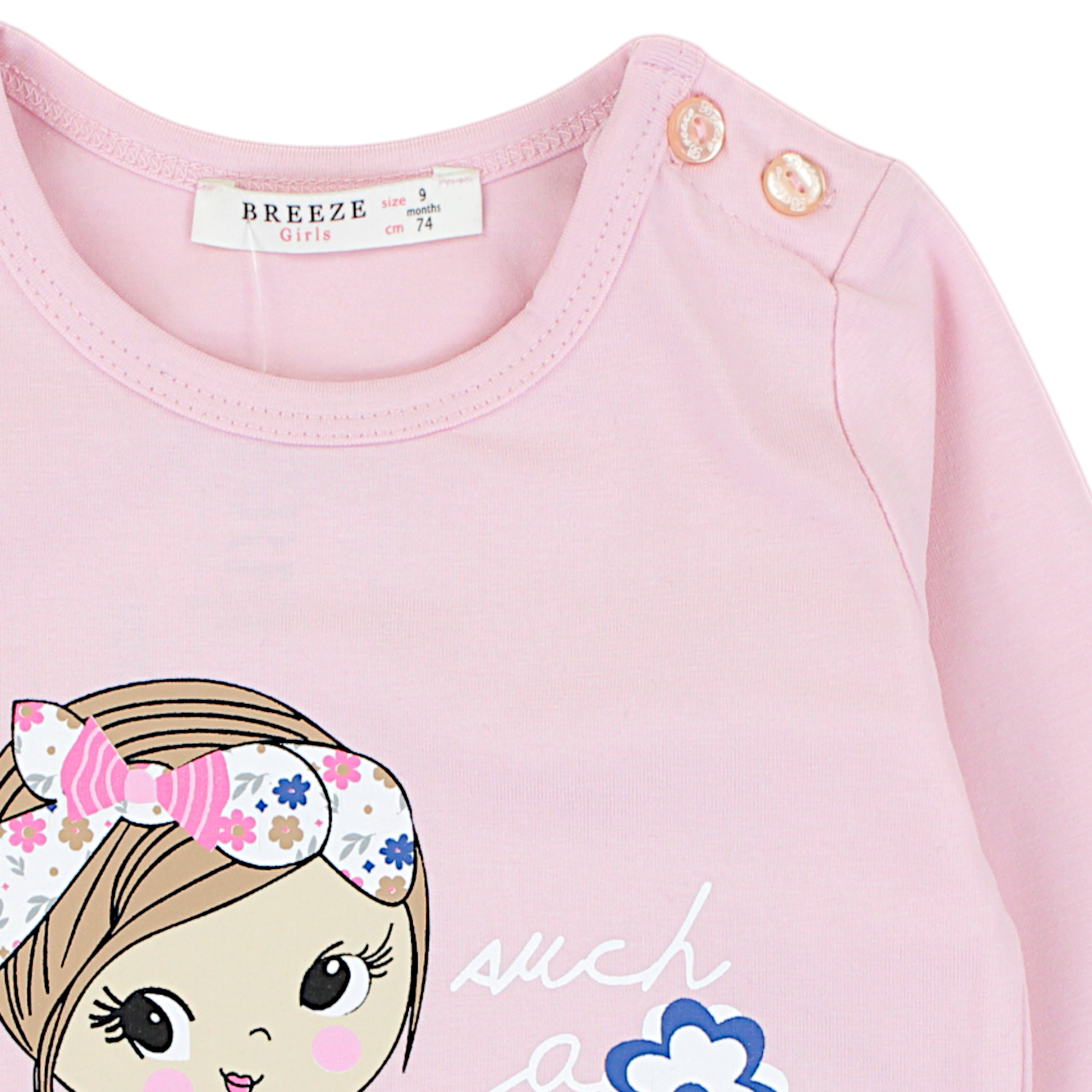 Stylish girl's set brands Breeze is a perfect choice for the season spring-summer . Consists of cute long sleeve blouse and comfortable trousers , creating the perfect proposition for everyday outfit for girl . Blouse in a delicate pink shade is decorated sweet girl print and a subtle inscription "such a lovely day" . It makes her stand out practical button fastening on the shoulder , which makes it easier putting on and taking off clothes .