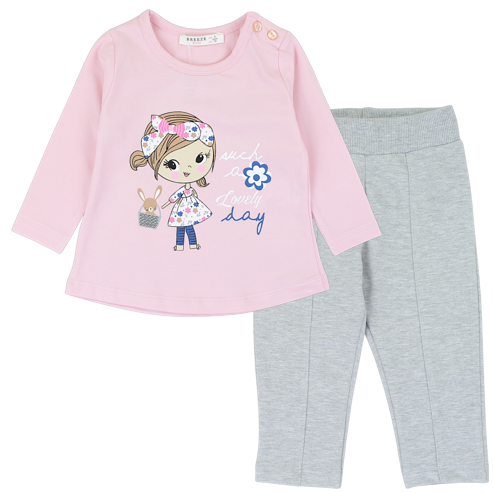 A charming set for girls by Breeze , consisting of a pink long-sleeved blouse and gray trousers . The blouse is decorated with a girl's graphic with a bow and the inscription "such a lovely day" . It has a comfortable two-button fastening on the shoulder , making it easier to dress your child. The trousers are soft , with an elastic waistband , ensuring comfort of wearing. The perfect choice for everyday styling and toddler activity.