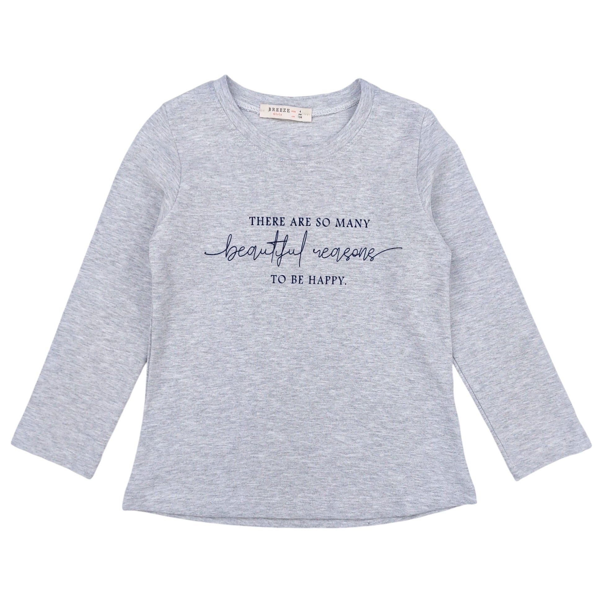 Girls' set consisting of a long-sleeved blouse and flared trousers in grey by Breeze, model 19709-23824 GKMOD, comes from the autumn-winter collection. The blouse has a subtle print with the inscription "There are so many beautiful reasons to be happy", which gives the whole thing a unique character. The flared trousers perfectly match the blouse, creating a comfortable and fashionable set for everyday use. Made of soft fabric, which consists of 45% cotton, 45% polyester and 10% elastane, ensuring comfort and flexibility. The perfect choice for colder days!