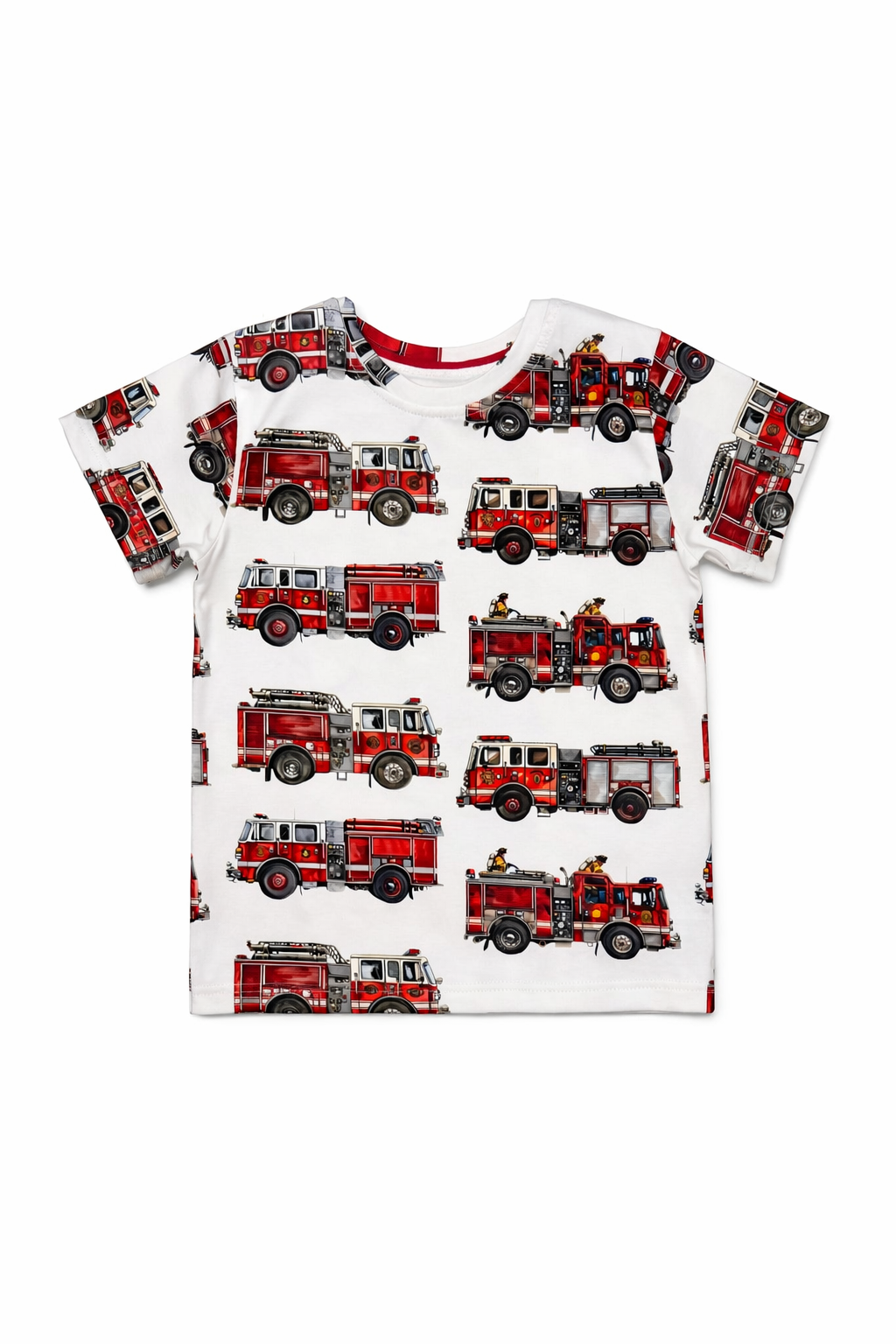 Chłopięca koszulka z motywem wozu strażackiego w kolorze czerwonym