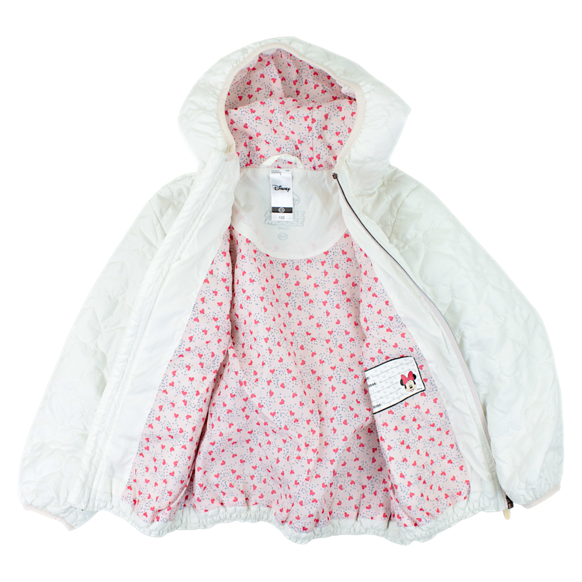 This white jacket from our collection is the perfect choice for colder days. Made of high-quality materials, it provides comfort and warmth. It features a hood and a front zipper closure for easy dressing. Additionally, two side pockets offer space for small items. The interior features a cozy lining with a lace heart pattern , adding a touch of charm. This jacket is perfect for little Disney fans, as it features the Minnie Mouse logo.