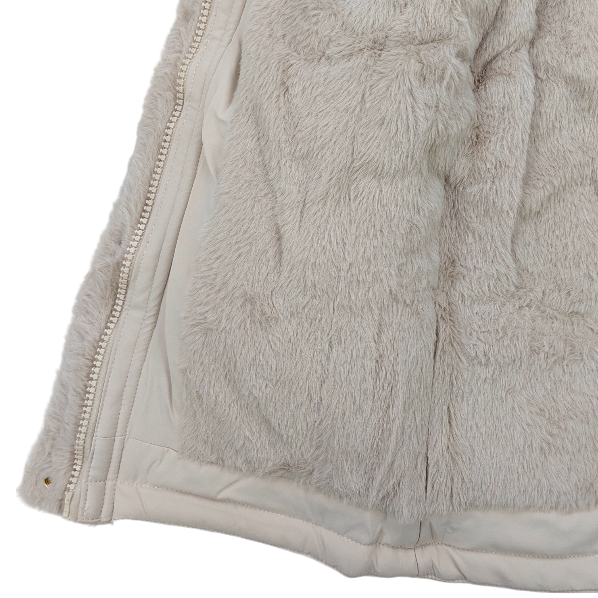 Model: long, waist-tight, teddy-lined, with a hood