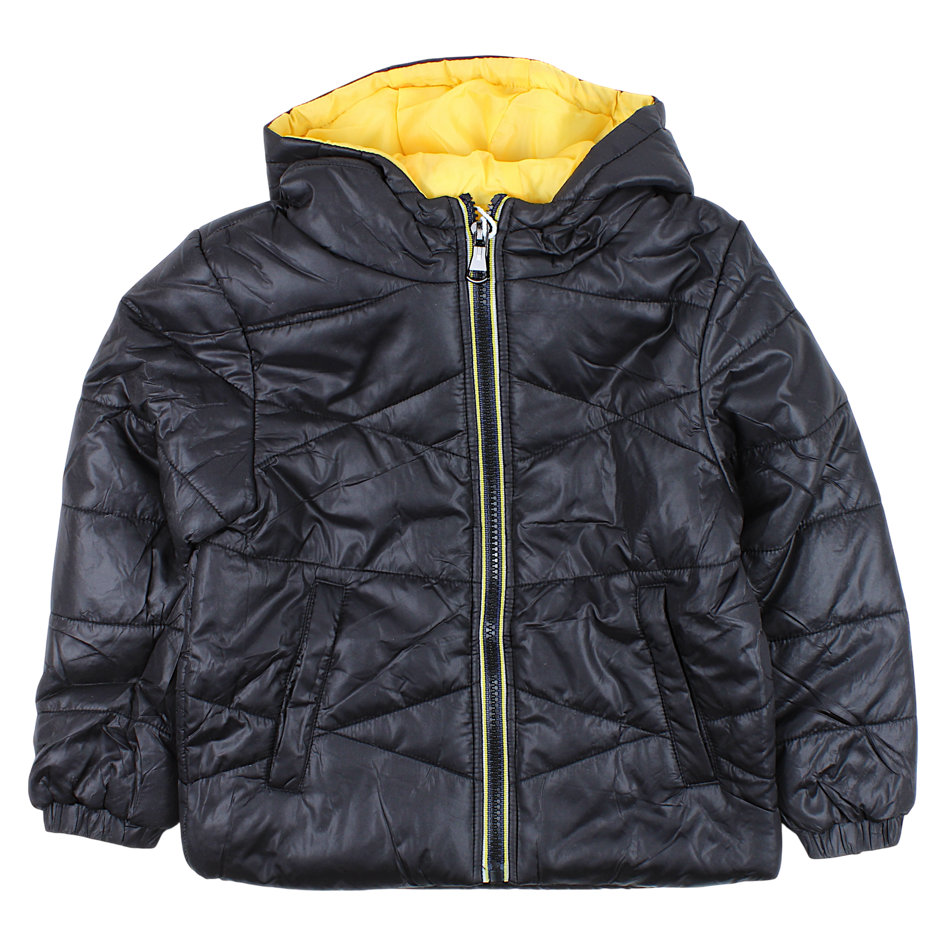 Lightweight, quilted boy's jacket ideal for transitional seasons. Made of durable polyester , it provides protection against wind and light rain. A two-way zipper makes it easy to put on and take off, and a warm lining in a contrasting yellow color adds warmth and style. The hood protects the head from the cold, and two side pockets allow you to store small items. Elastic cuffs on the sleeves prevent the cold from getting in.