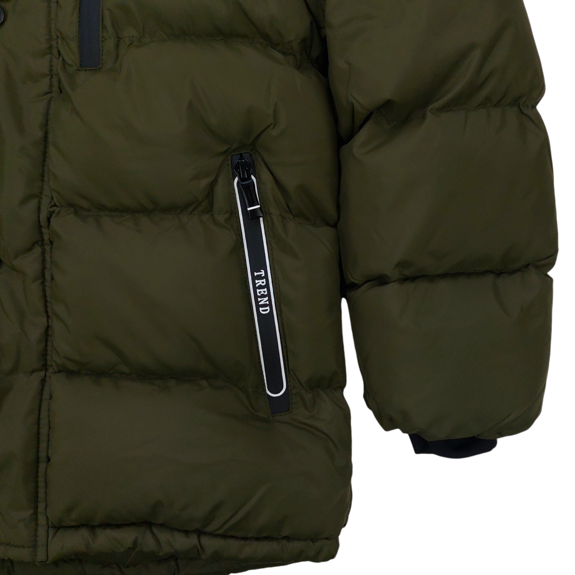 Warm, winter jacket for boys in khaki, with a detachable hood finished with faux fur. Long sleeves and elastic cuffs provide excellent protection against the cold. The jacket has three pockets - two lower ones fastened with a zipper and one upper pocket, ideal for small items. Additionally, a zipper and a flap fastened with snaps provide full protection against wind and cold. The inside insulation on the teddy bear provides thermal comfort.