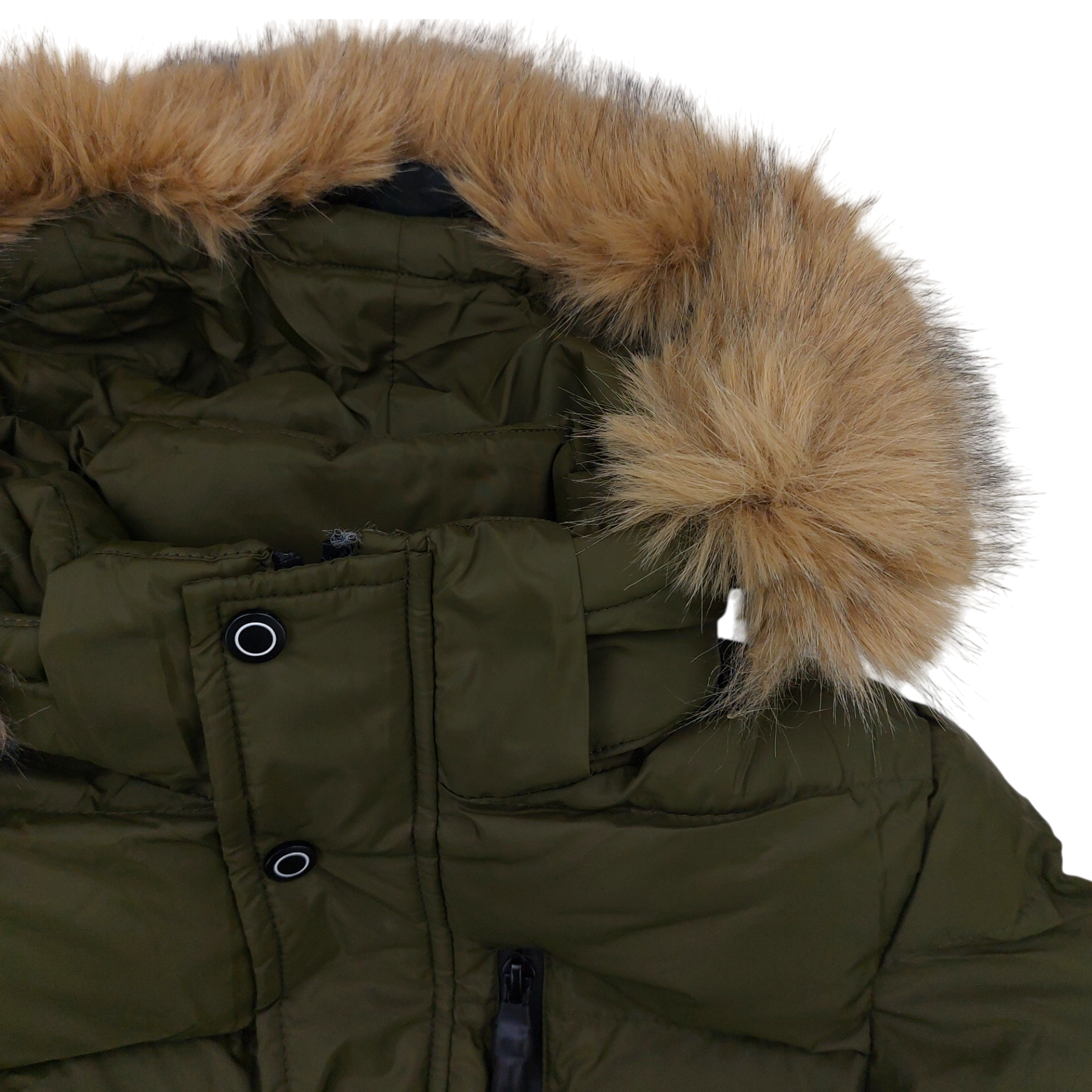 The zipper, combined with an additional flap fastened with snaps, provides additional protection against wind and cold, making the jacket ideal for winter walks, playing in the snow and everyday trips to school. The khaki color is a classic that matches many styles, and details such as a detachable hood and fur trim add a fashionable, winter character to the jacket.