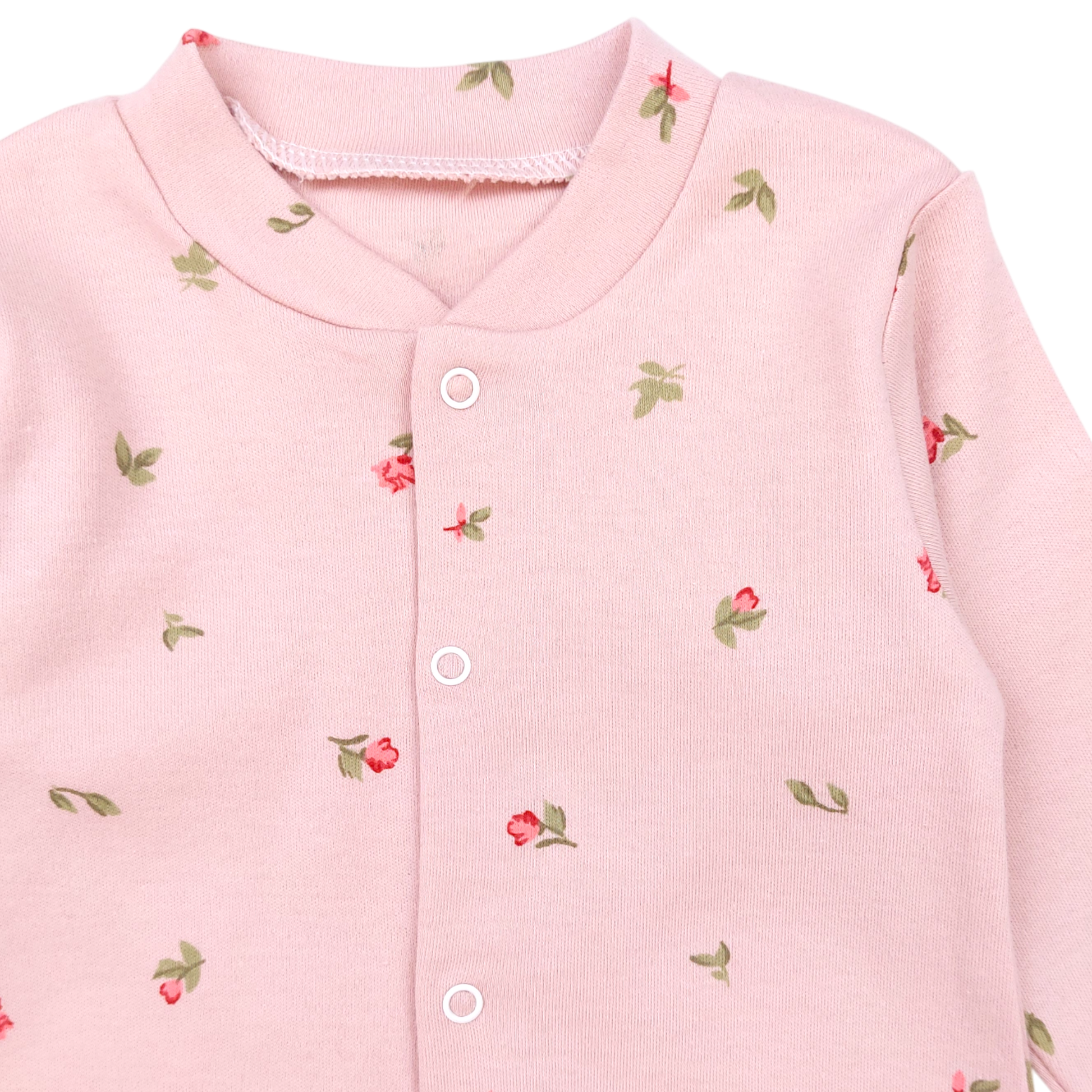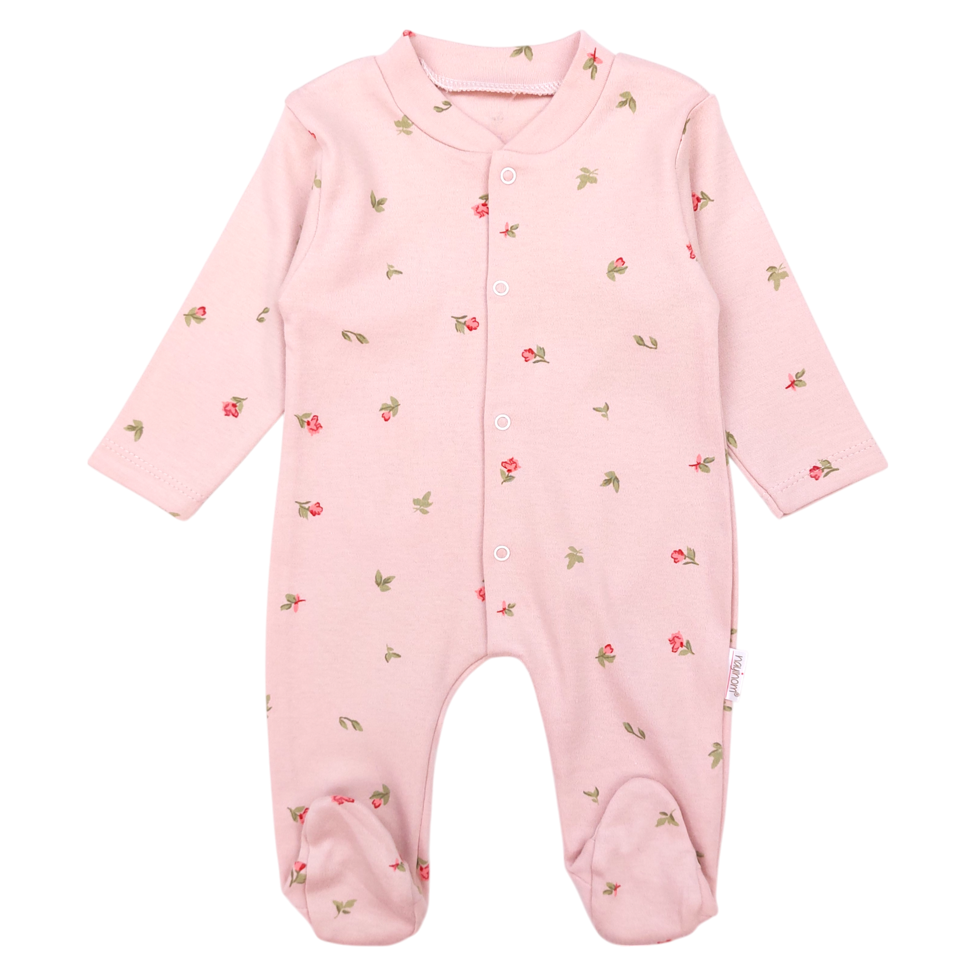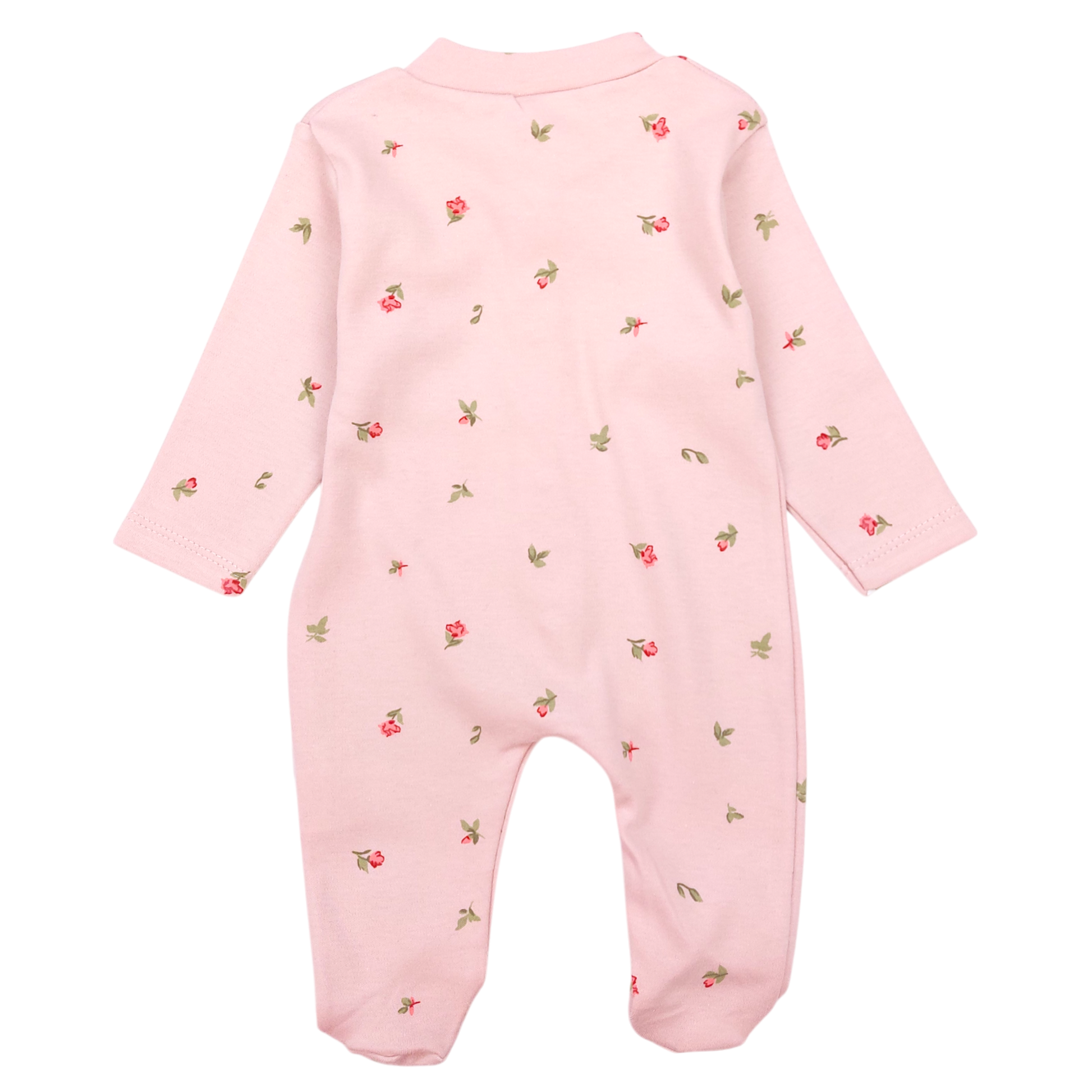 A delicate girl's romper in a powder pink color , perfect for the fall-winter season. The model is decorated with a subtle pattern of small flowers, which emphasizes the girlish charm. Equipped with a practical snap fastening and full feet, it provides comfort and protection against the cold.