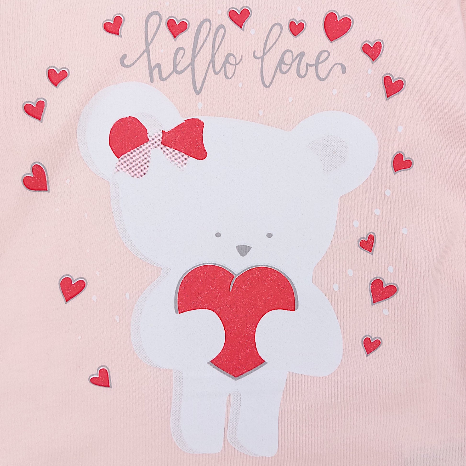 Lovely Teddy bear girl's pajamas Vitmo is the perfect choice for the fall-winter season. A set in a subtle shade apricot combines a fashionable look with exceptional comfort. The upper part of the pajama is made of soft cotton It features long sleeves and a beautiful print of a teddy bear holding a heart, surrounded by small red hearts. The inscription "Hello Love" adds a unique charm to the pajamas and refers to its friendly nature.