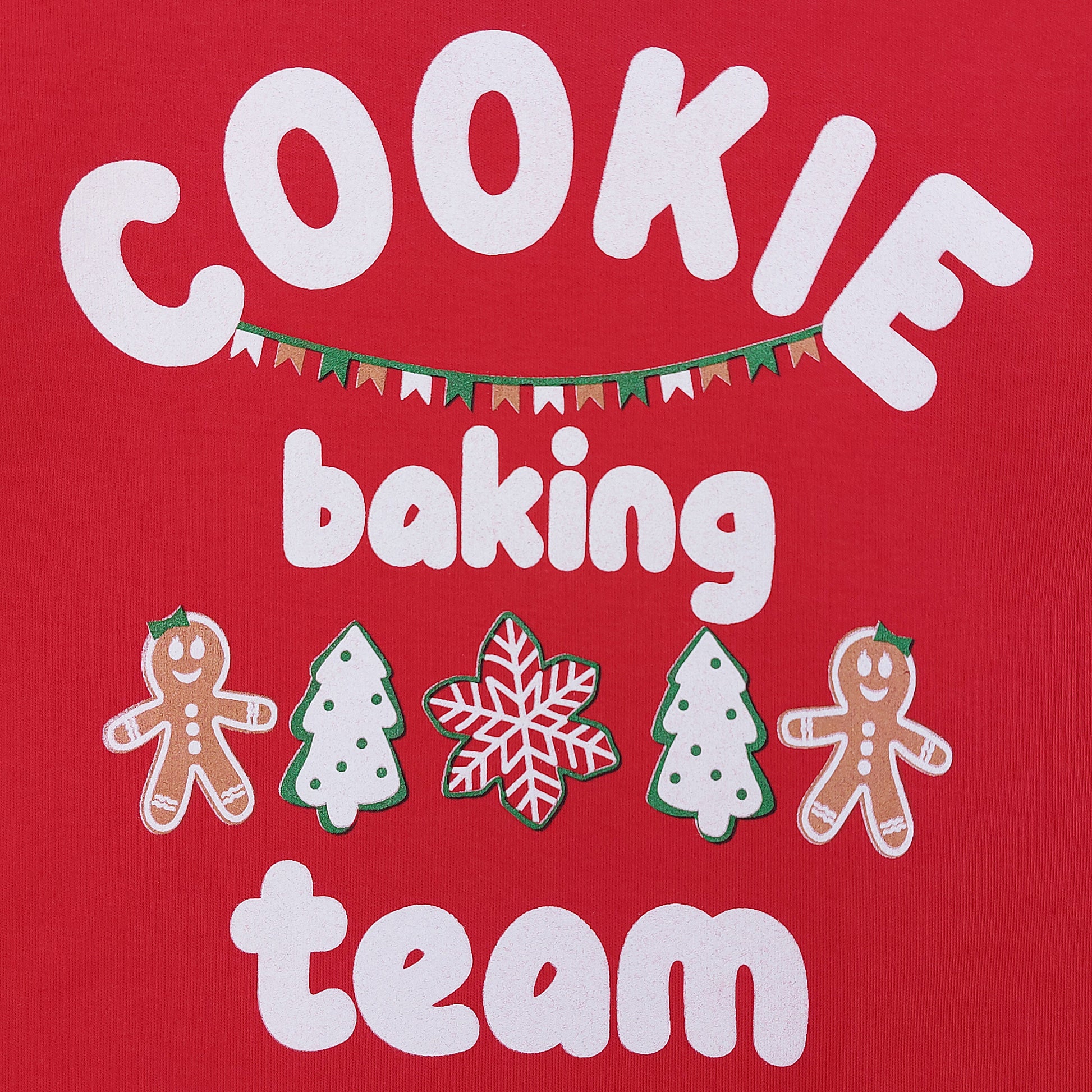 Red Christmas pajamas for girls Vitmo is the perfect choice for the fall-winter season, especially for the holiday season. Made of soft and breathable cotton , provides full comfort and warmth during cold nights. The upper part of the pajama has long sleeves and a funny print with the inscription "COOKIE baking team", as well as graphics of gingerbread, Christmas trees and Christmas decorations, which perfectly introduce the holiday mood.