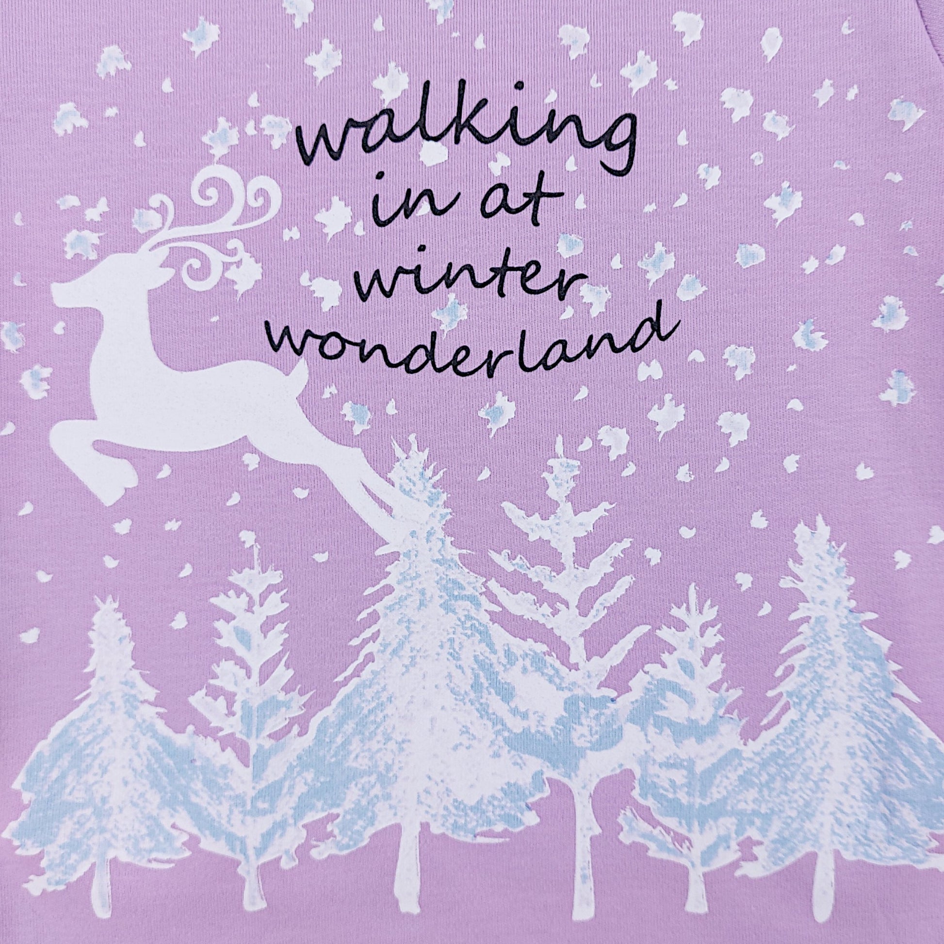 Christmas pajamas for girls in purple , consisting of long sleeves and long pants. Top decorated with a winter print with a reindeer, snowflakes and the inscription "Walking in a Winter Wonderland". Pants decorated with a pattern of reindeer and Christmas motifs. Comfortable, elastic cut without pockets and fasteners ensures comfort and freedom of movement.