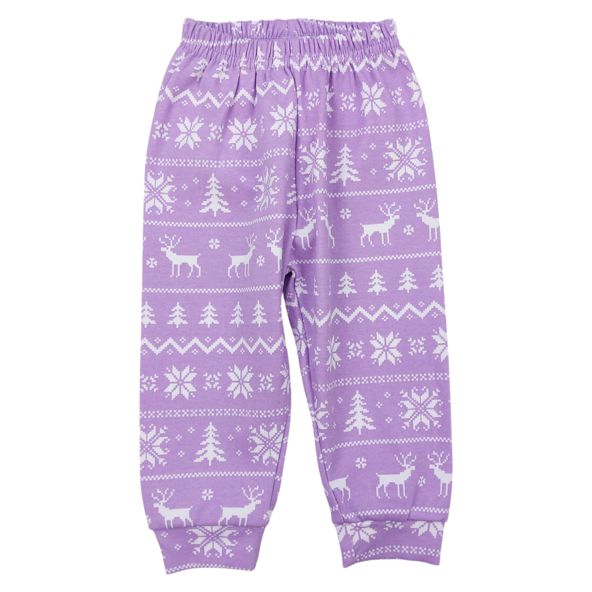 The purple trousers are decorated with a Christmas pattern of reindeer, Christmas trees, snowflakes and other winter motifs that perfectly complement the set. The elastic waistband ensures a comfortable fit, and the lack of pockets and fasteners makes the pajamas practical and comfortable to wear.