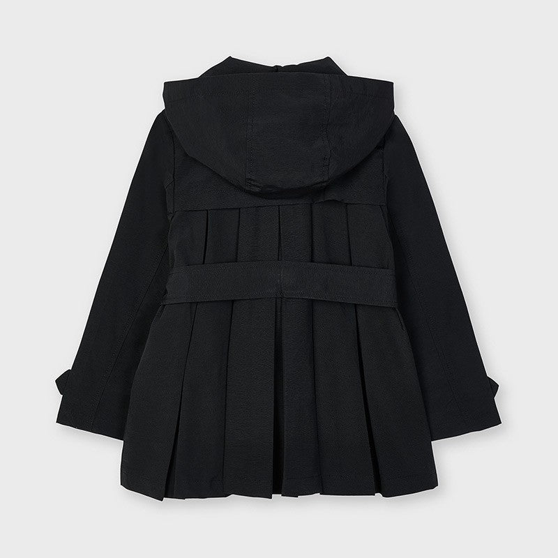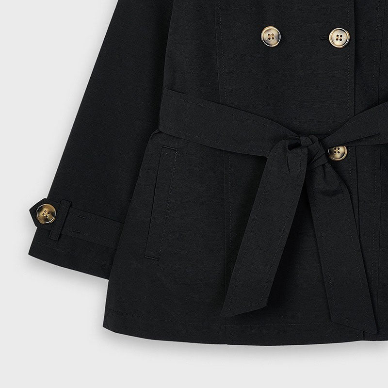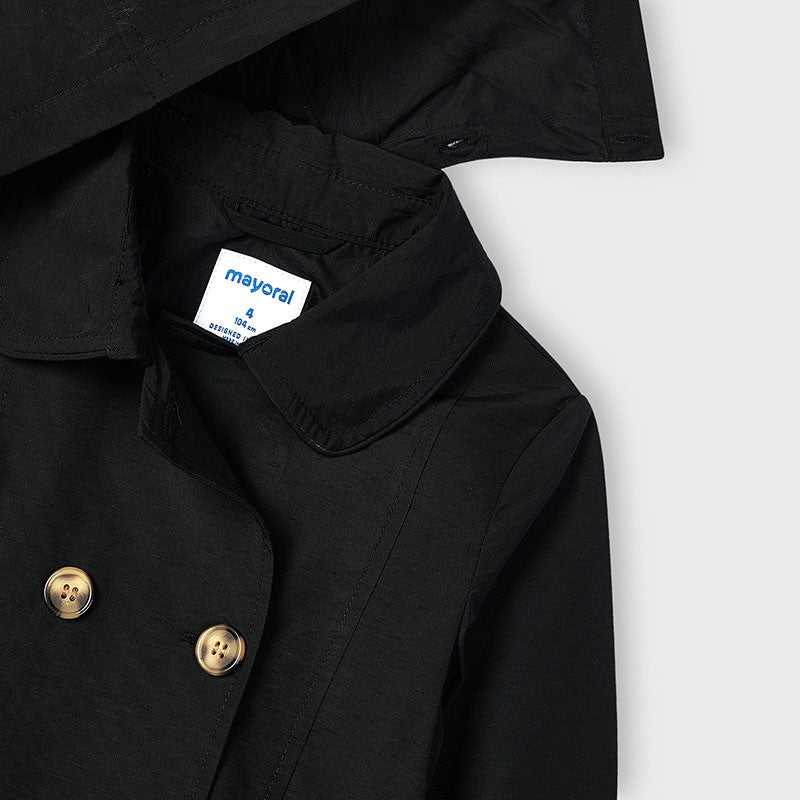 Elegant coat for children with a detachable hood, pockets and collar, fastened with buttons, tied at the waist for girls Mayoral from the Mini girl collection from the spring-summer season, product code 3487, color 62 Black. Children's clothing.